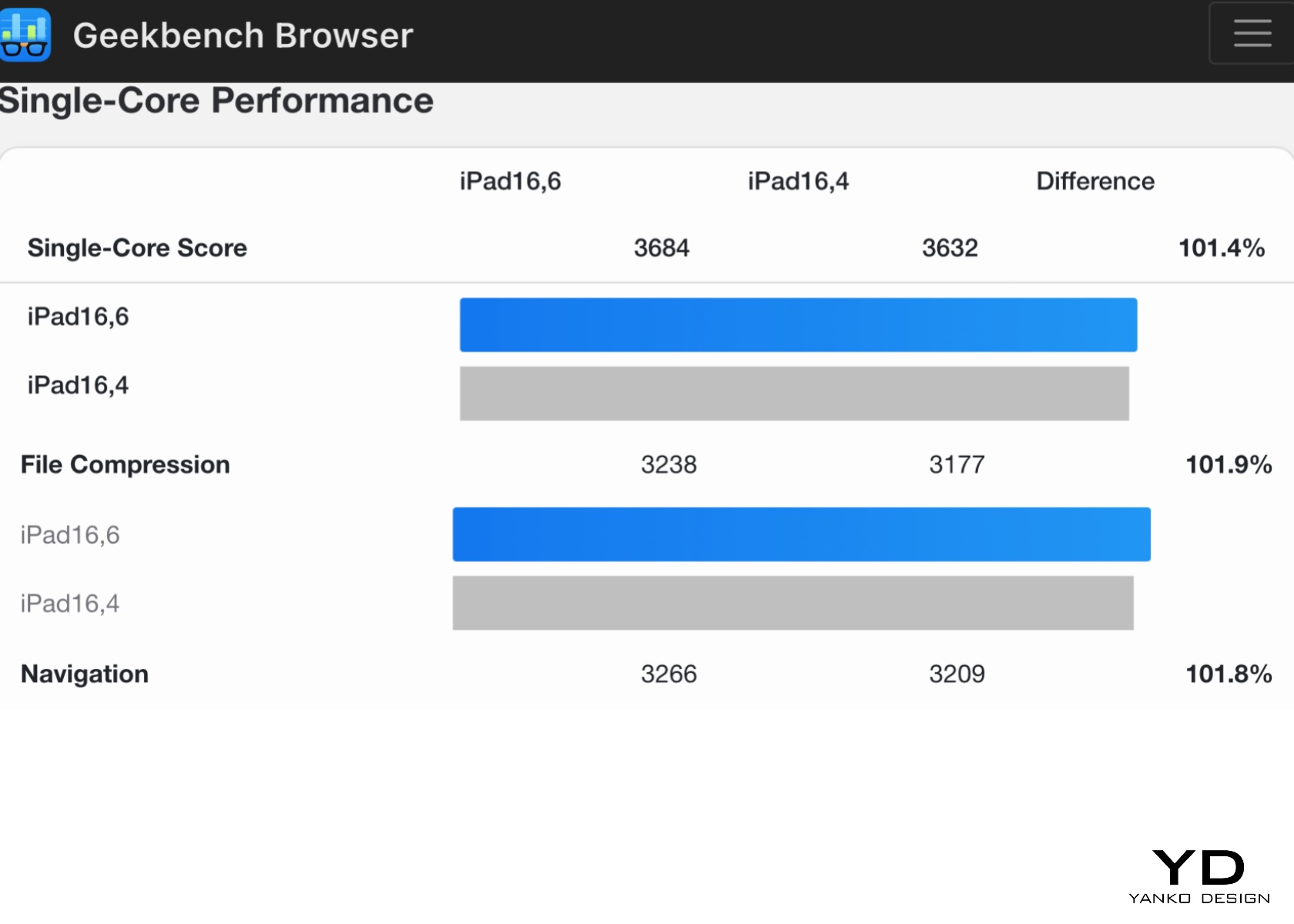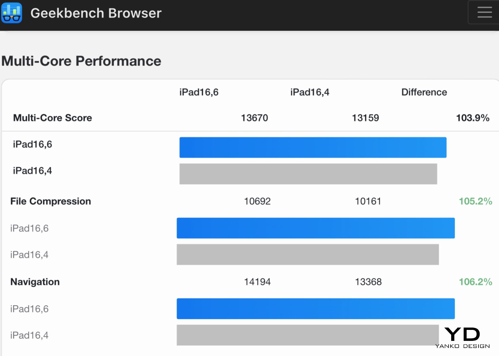 Benchmarks like those from Geekbench 6 highlight the iPad Pro M4’s significant performance capabilities. For instance, the iPad Pro M4 (iPad16,6) scores an impressive 13670 in multi-core performance and 3684 in single-core performance, compared to 13159 and 3632, respectively, for the iPad16,4 base model. These results underscore the enhanced performance of the additional cores and more RAM in the iPad Pro M4.