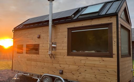 The dwelling occupies 48 sq m and is spanned over three floors. It isn’t small enough to be a tiny home, but it is quite compact. It is a lightweight building, made using steel, and a wooden facade covered with rubber. The structure is anchored using screw piles, which is a less harmful technique than concrete foundations. It has been positioned near some trees, which offer shade and shelter. The ground floor of Stay Under the Radar is mostly occupied by the living area which includes seating and a dining table. A kitchen is also integrated into the space. Other sections of the retreat include a bathroom with a shower, sink, and a separate toilet. The second story houses a bedroom with two single beds, while the third story accommodates a double bed and glass ceiling.