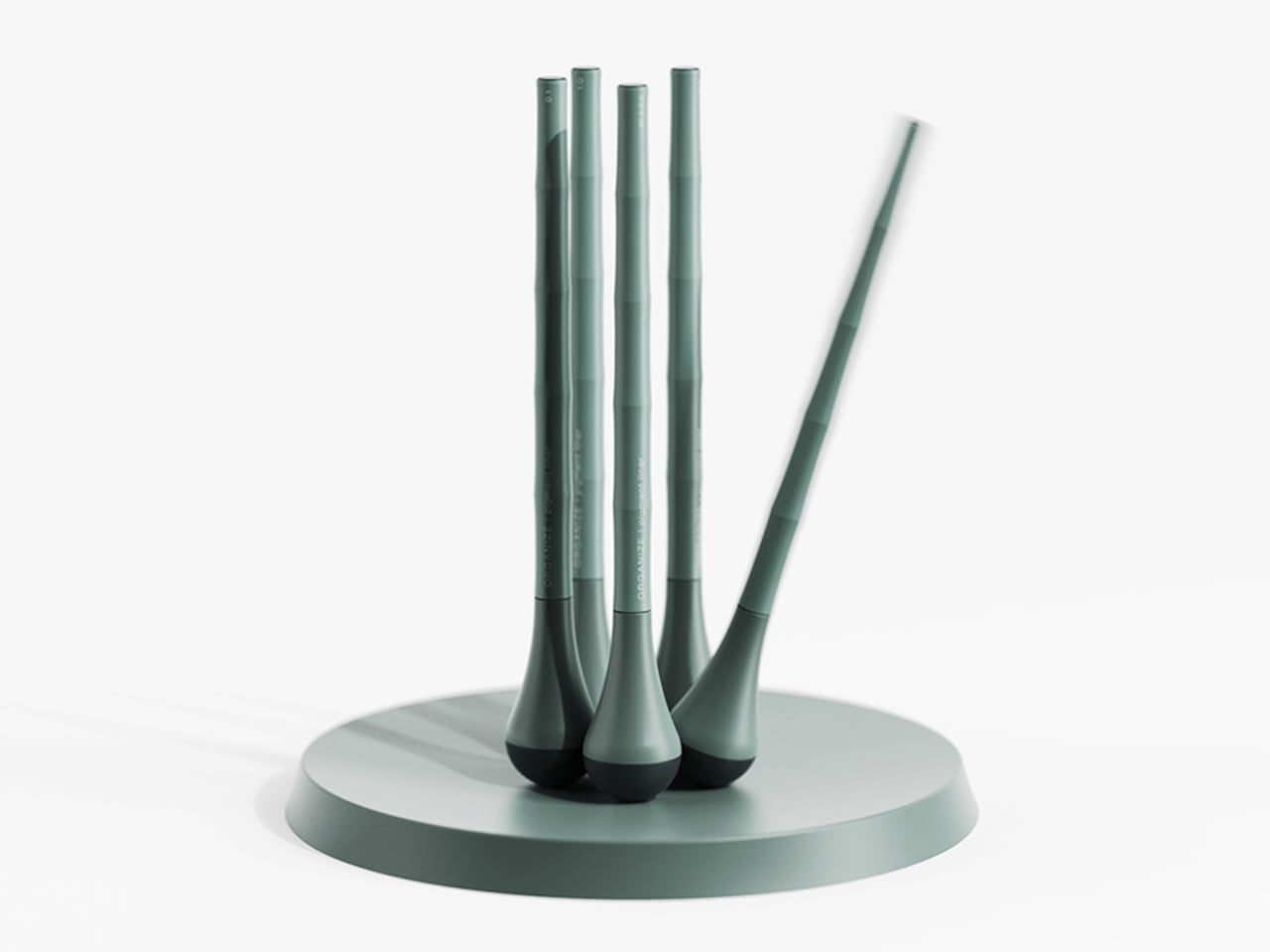 These minimal bamboo-inspired pens feature a magnetic base for self-organization. Designed by Kim Minsu, they resemble the aesthetic appeal of bamboo plants. The pens return to an upright position on the flat base, ensuring easy access whenever needed while adding a stylish touch to any workspace.