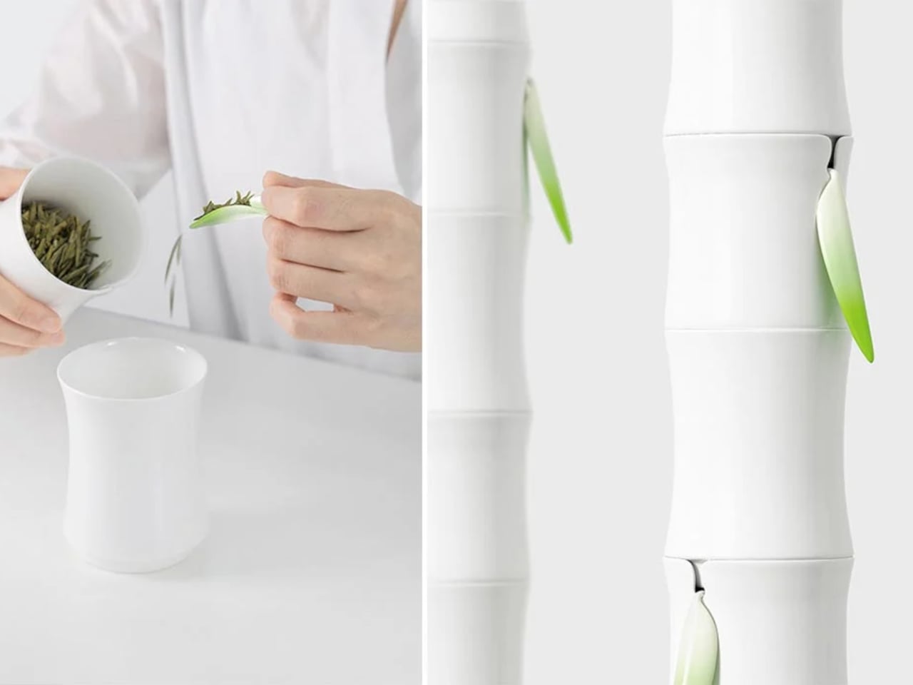 This minimalist tea set, designed for a luxury hotel brand in Jintan District, southern China, integrates the region’s renowned bamboo and high-grade green tea. The set, resembling bamboo, comprises a teacup, teapot, and tea spoon that stack to form a bamboo shape, symbolizing the traditional tea brewing process. This design seamlessly blends elegance with functionality, offering a serene addition to any kitchen.