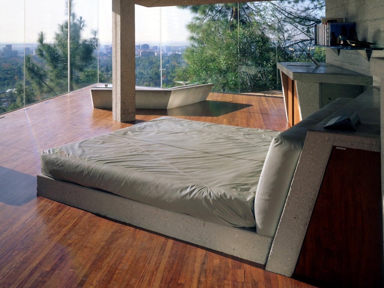 Among the many redesigned parts of the home, the master bedroom stands out as a showcase of Lautner’s forward-thinking vision and Goldstein’s desire for something completely unique. Redesigned to fit Goldstein’s preferences, the room features a concrete lounge that appears to grow from the floor itself, positioned perfectly at a glass corner that disappears at the press of a button. This space is a bedroom reimagined—built with exacting precision to meet Goldstein’s vision.