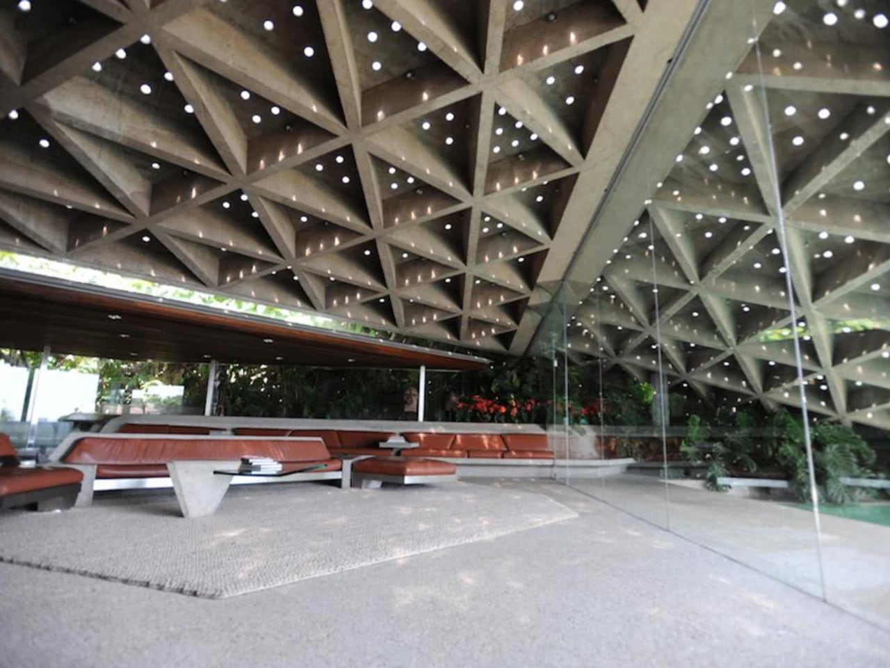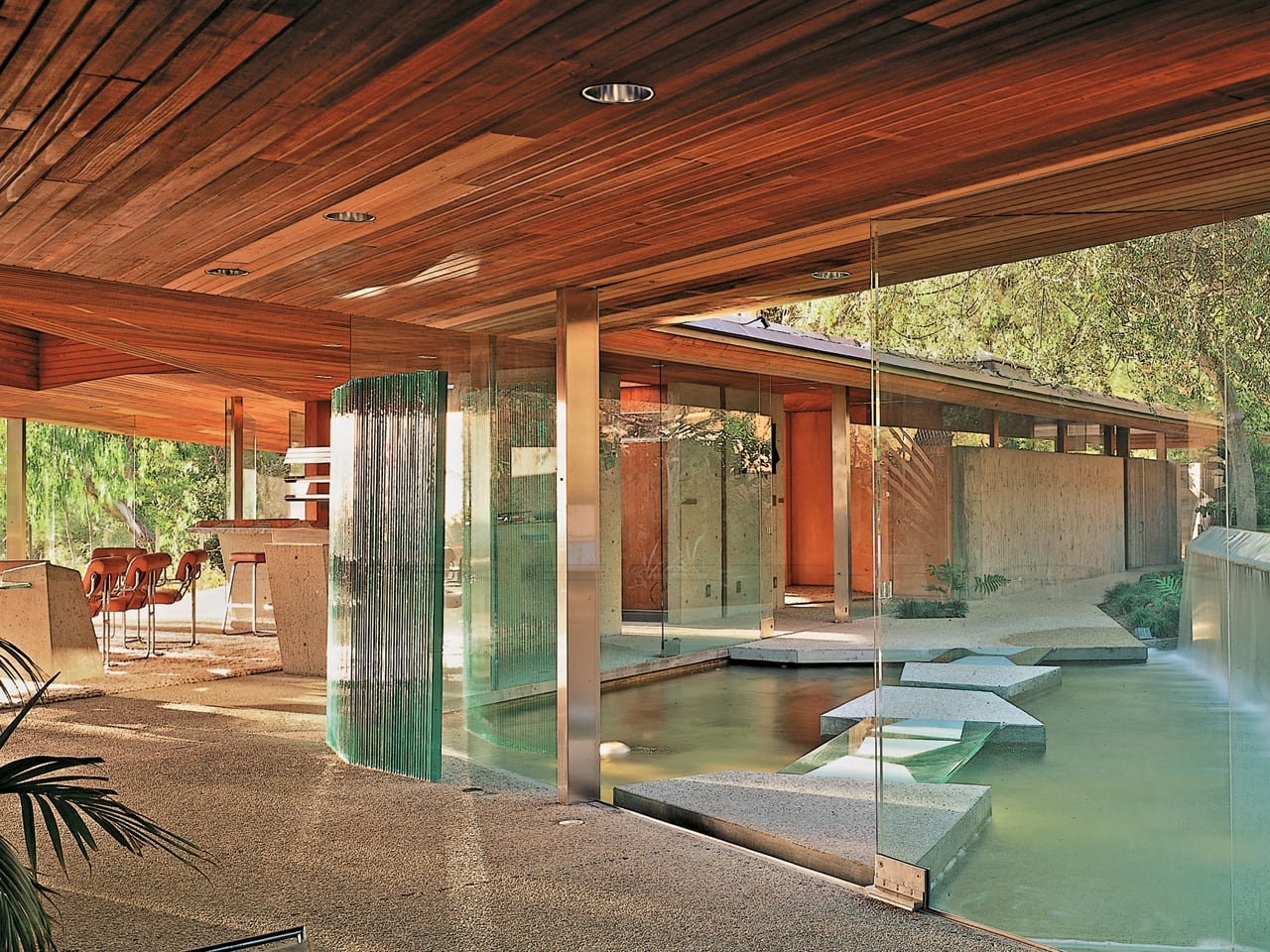 Goldstein went beyond simple repairs, working alongside Lautner and later architect Duncan Nicholson to completely transform the property. Together, they took it far beyond its original state, turning it into an architectural icon that reflected Goldstein’s intense attention to detail. The renovations introduced innovative elements for their time—fully automated windows, integrated furnishings, and open spaces that seamlessly connected indoor and outdoor environments. Goldstein’s modifications included removing dated carpeting and exposing the signature coffered concrete ceiling pierced by 750 skylights made from drinking glasses. In the Sheats-Goldstein Residence, “drinking glasses” refer to a unique architectural feature designed by John Lautner. Specifically, 750 drinking glasses were ingeniously cast into the concrete roof structure of the house, creating an extraordinary skylight system.