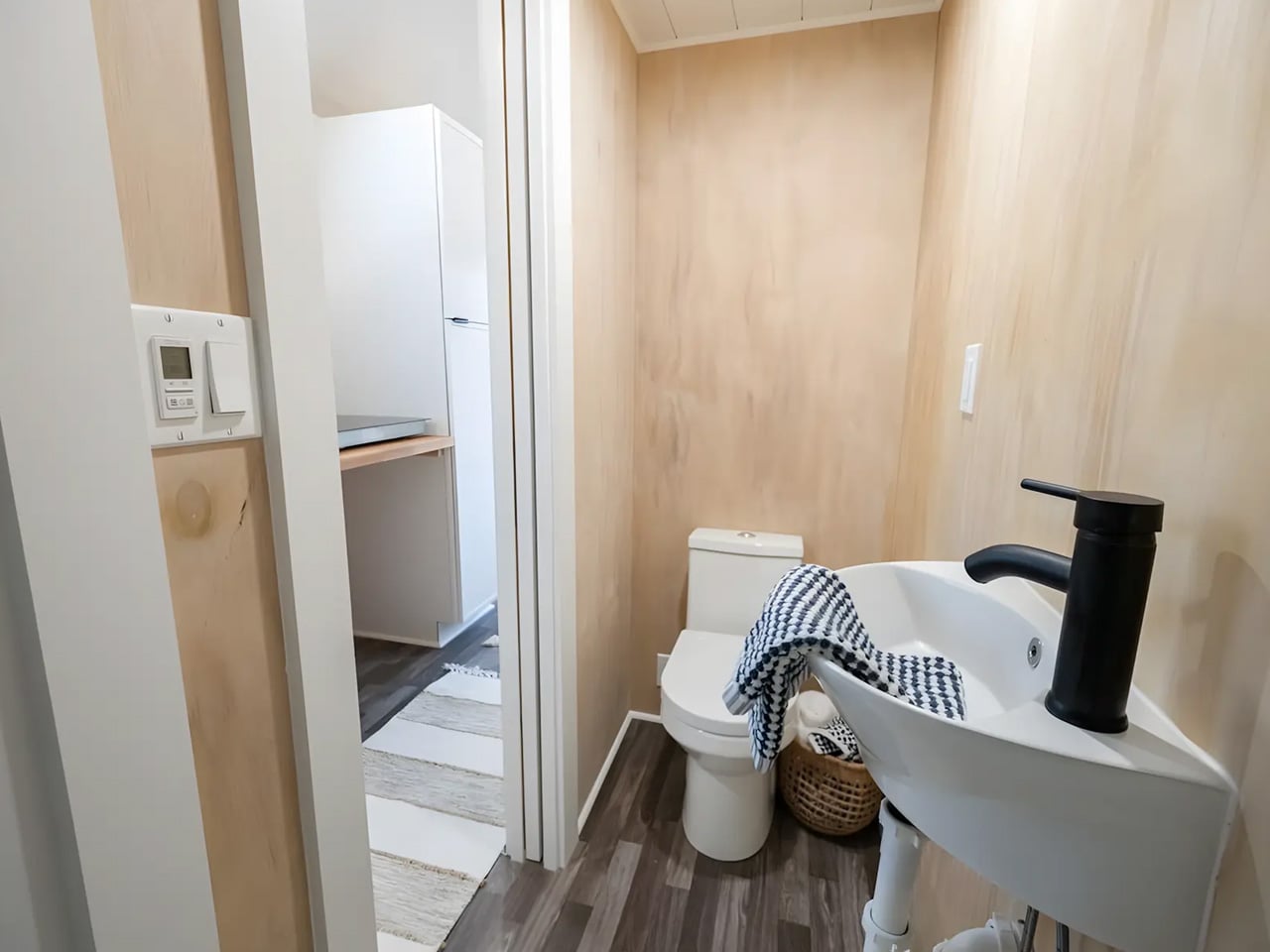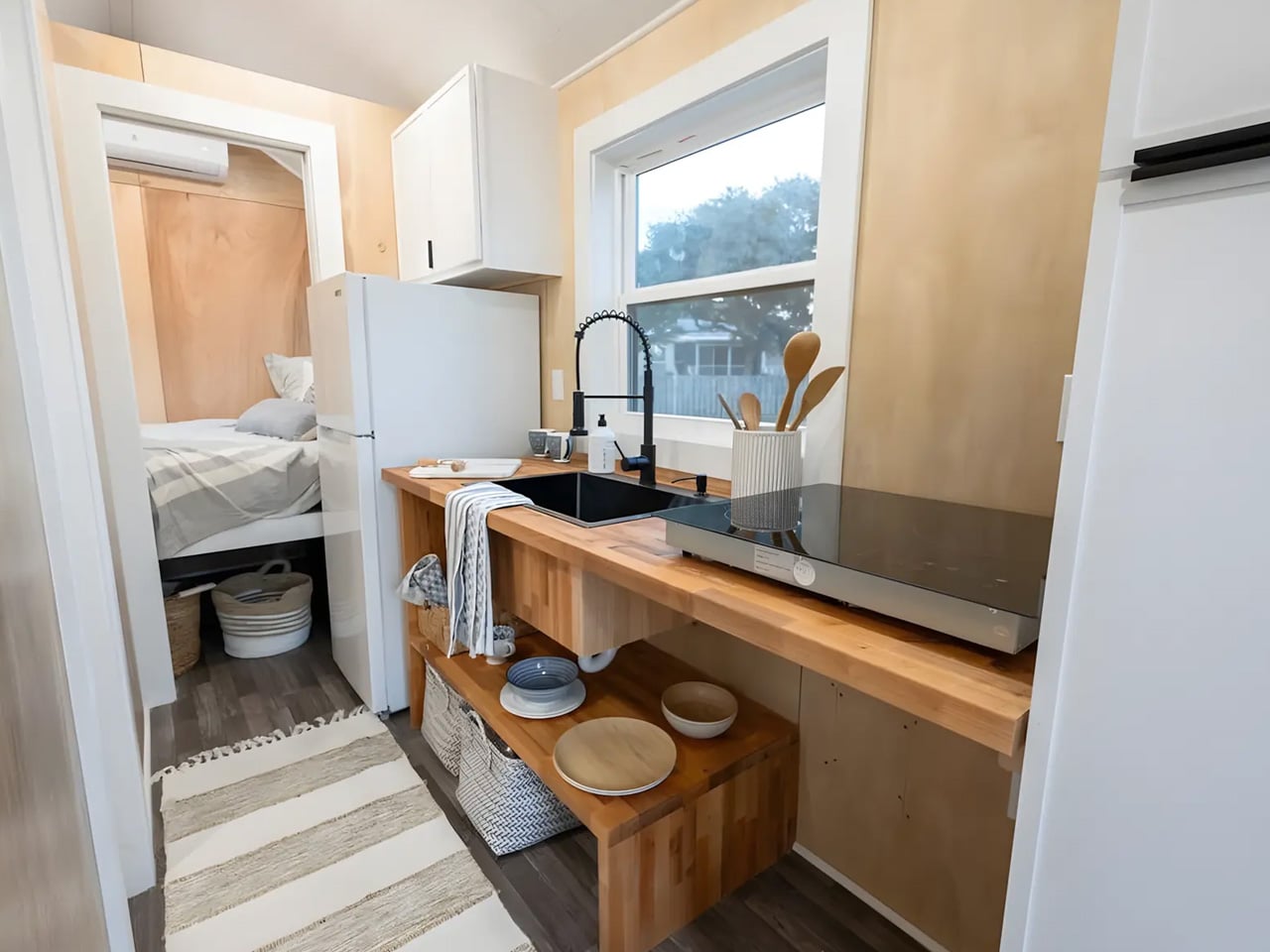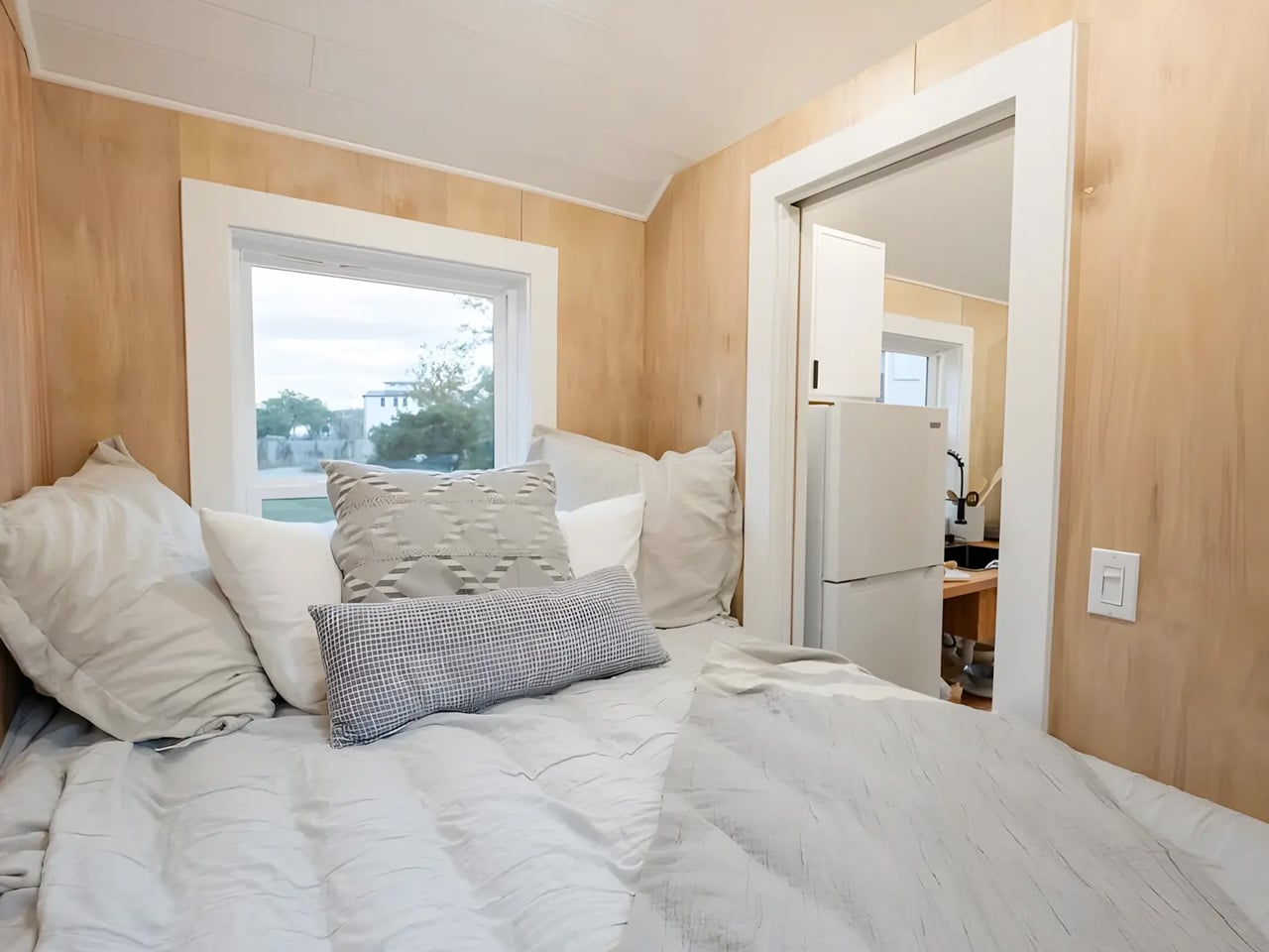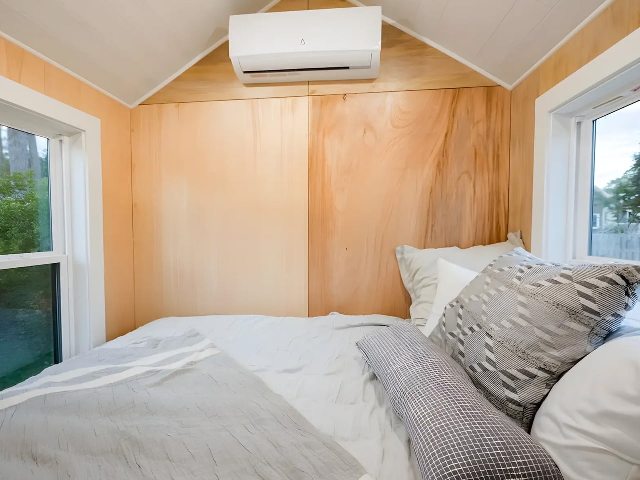 The tiny home only includes one bedroom, and since it is on the ground floor, it includes plenty of headroom to stand upright. The bedroom includes a double bed with integrated storage, as well as a mini-split air-conditioner, which will heat and cool the entire home. Enough though the bedroom isn’t the largest, the fact that you can stand upright, unlike most bedrooms in other tiny homes is a plus point.