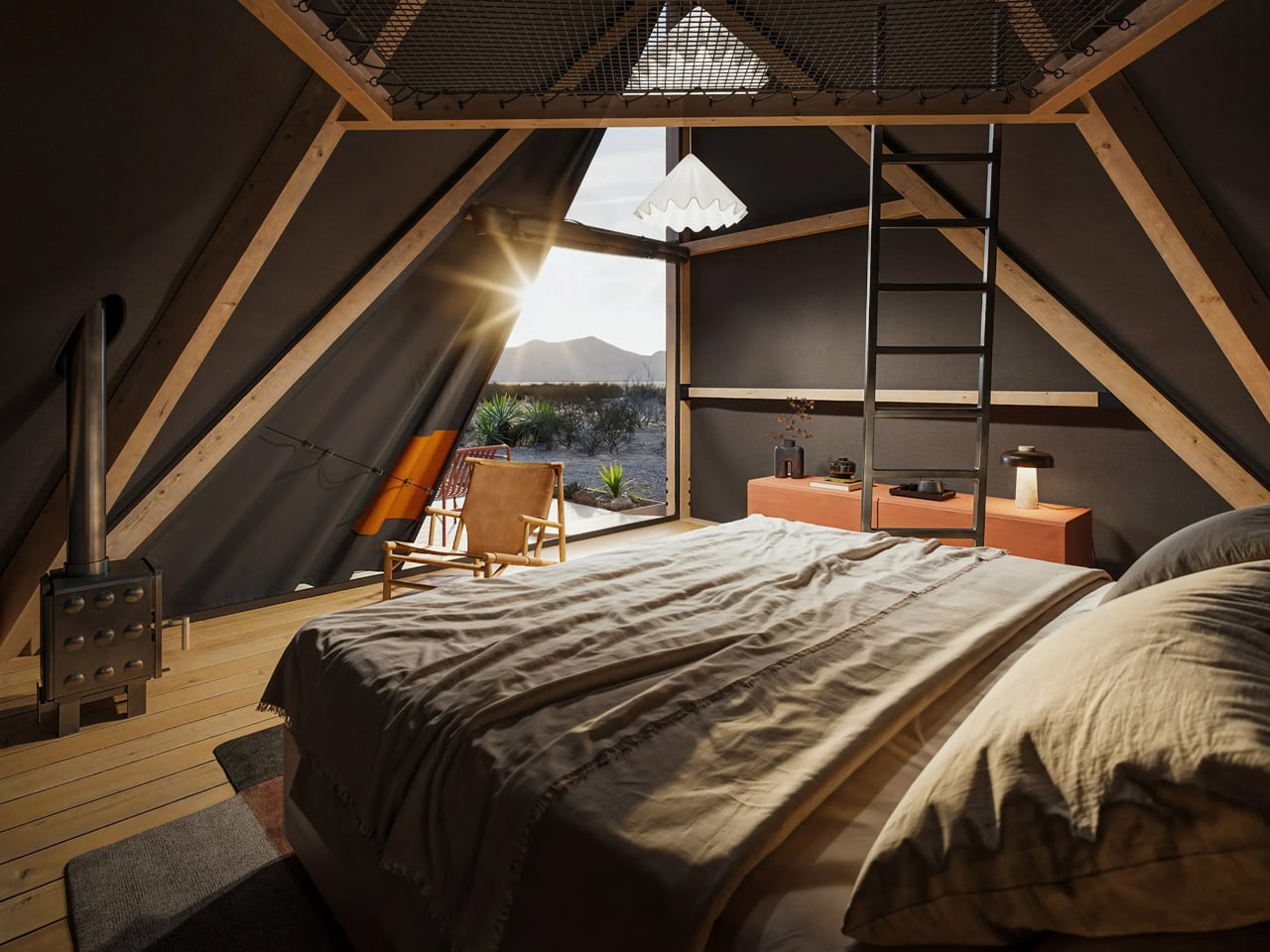 The interior occupies around 193 sq ft and looks quite spacious and simple. The layout comprises a sofa bed and a compact wood-burning stove on the ground floor. It also includes a storage area and a bedside table. A ladder offers access to the optional upper floor which is netted. This section can be utilized as a hangout area, as a sleeping loft, or for storage. The tent seems to be intended for hotels and glamping sites, although it could be great for personal use too.