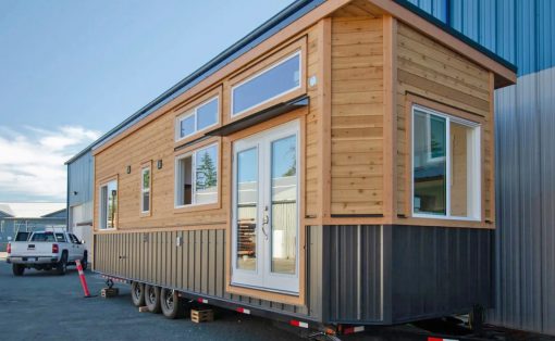 As you enter the home, you are welcomed by the living area which includes a sofa for two, some storage space, and a TV. The kitchen is closely located, it contains solid mahogany countertops with a steel sink, a microwave, an electric oven with an electric cooktop, and a fridge/freezer. The kitchen also accommodates loads of cabinetry and a pull-out pantry. The bathroom is located next to the kitchen, and it is quite spacious with a washer/dryer hookup, a flushing toilet, a vanity sink, and a shower/bath unit which isn’t very common in tiny homes.