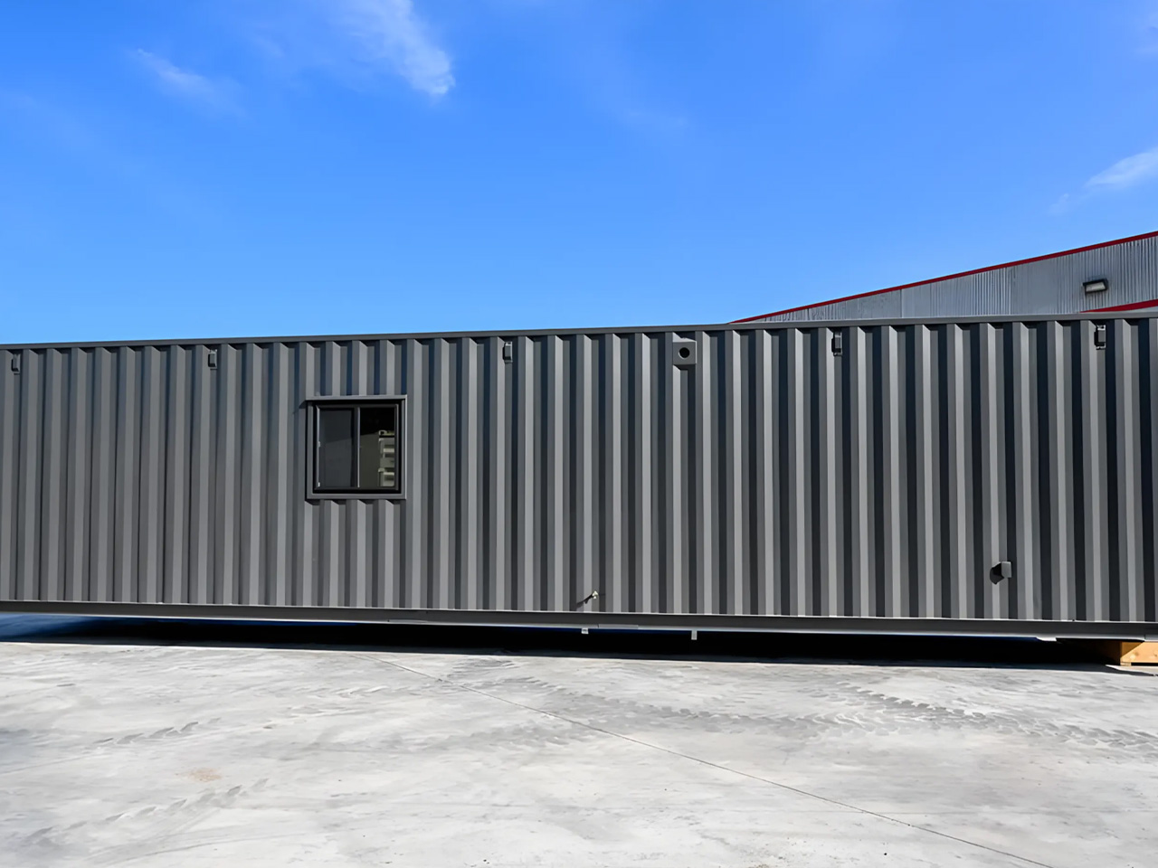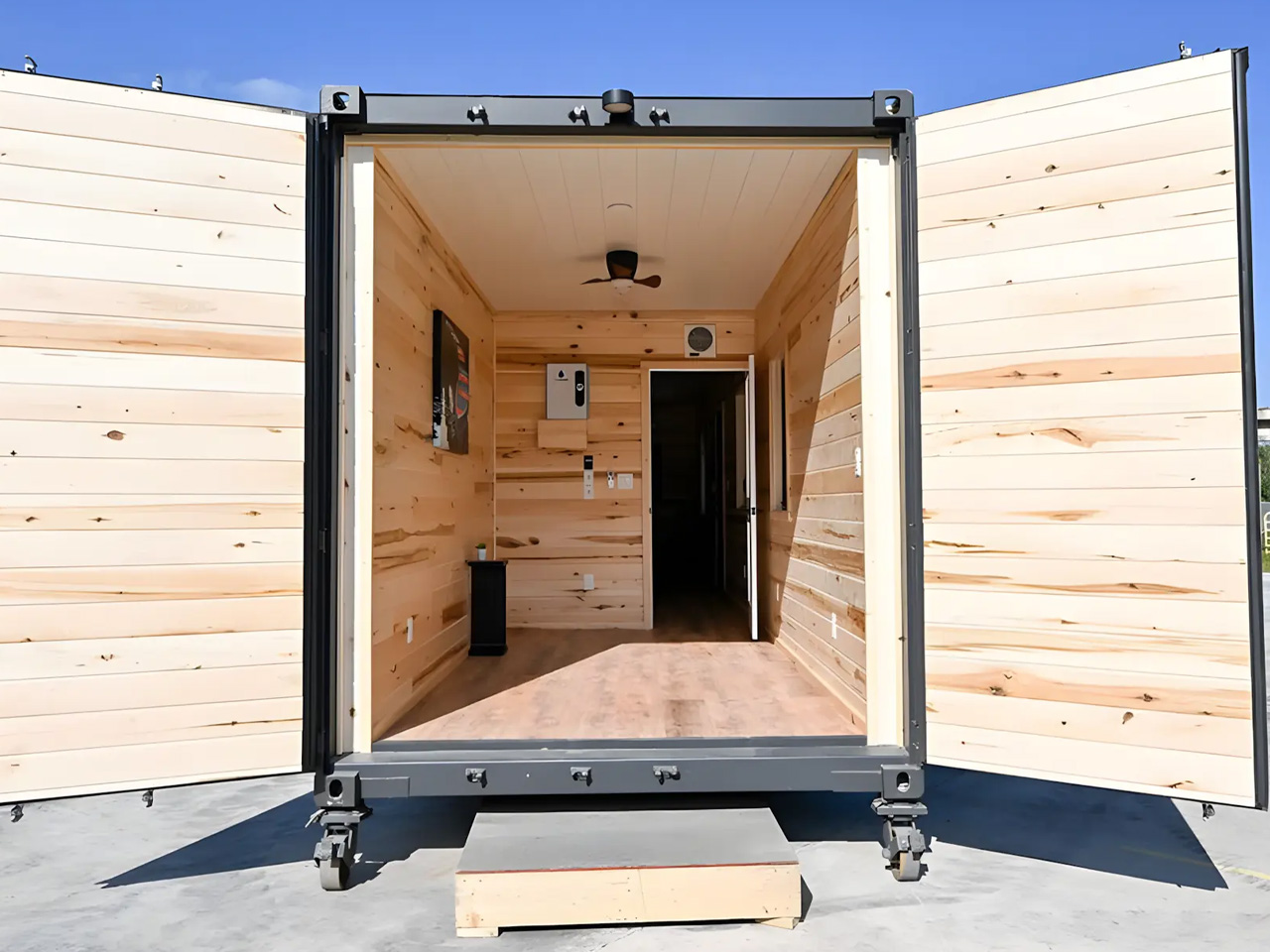 On the opposite side of the container from the living room, you’ll find the versatile garage space. Depending on your needs, the garage can be transformed into a master bedroom, providing a more spacious and private sleeping area. It can also be configured to include multiple bunk beds, making it an ideal solution for accommodating additional guests or family members