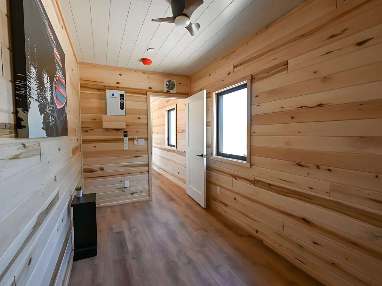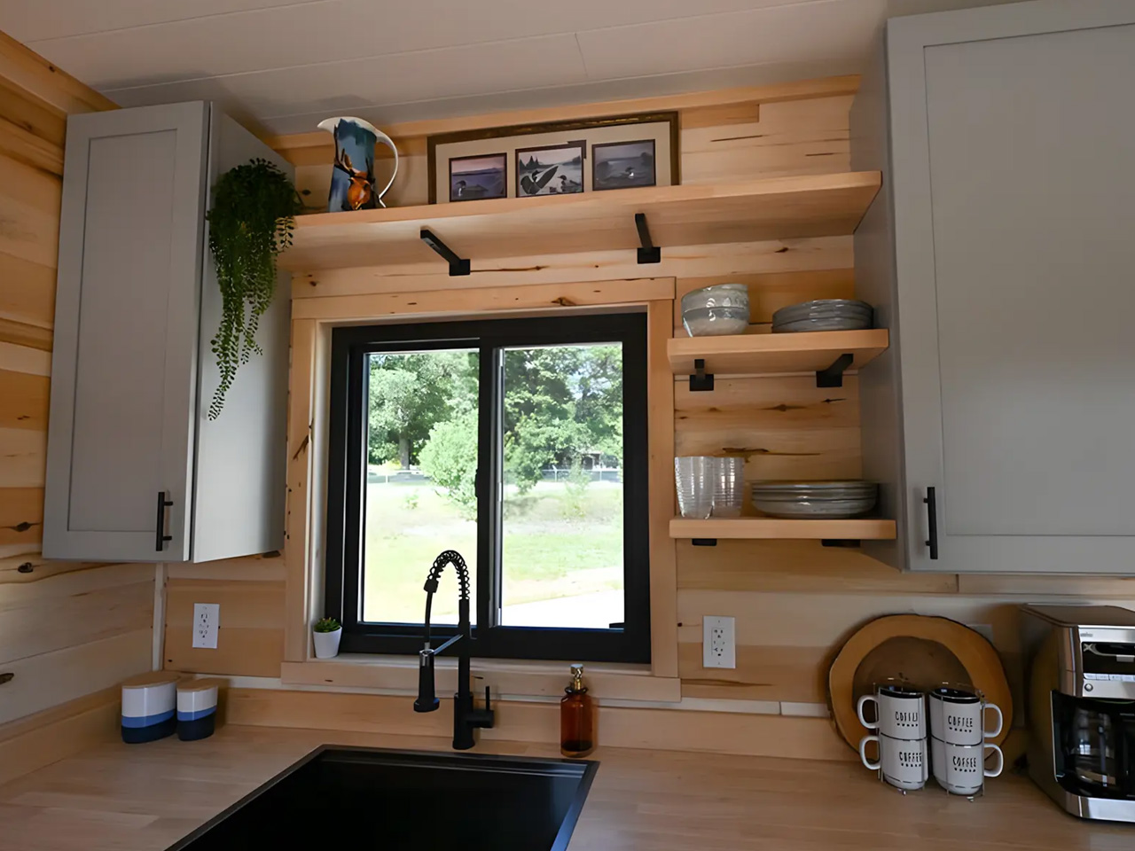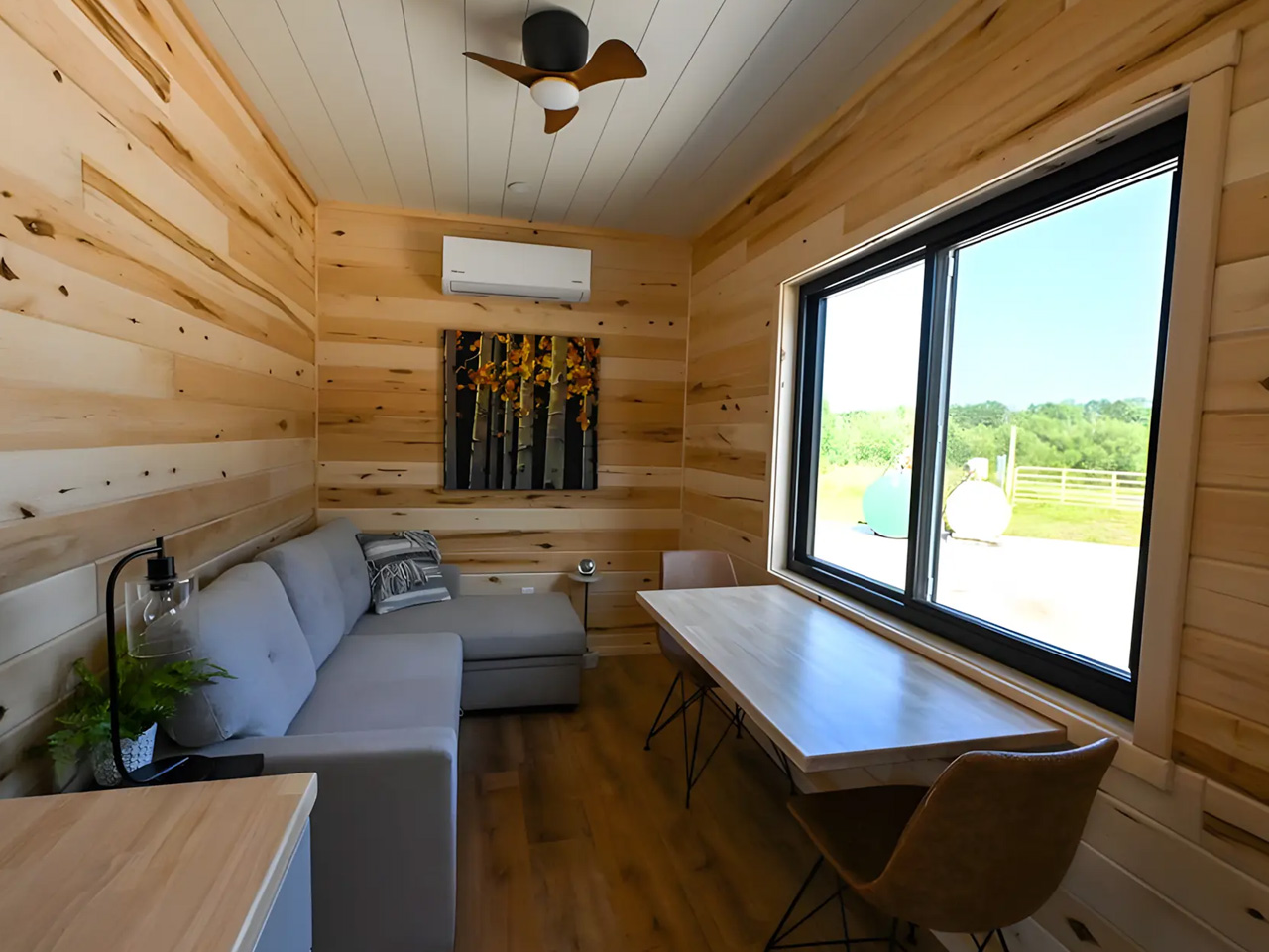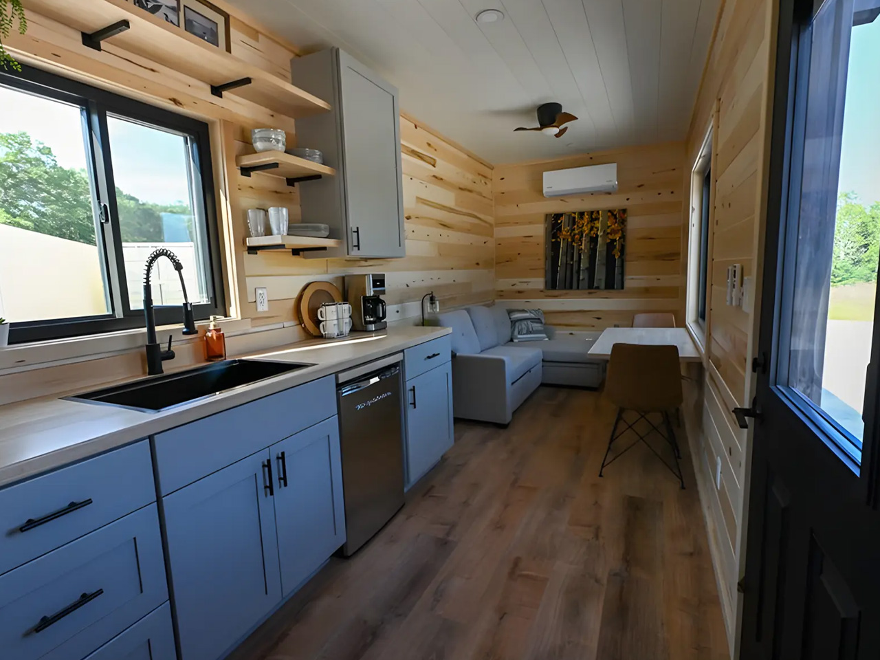 The Augustine tiny home is equipped with hookups for power and water, but you could also opt for the off-the-grid option with water tanks and solar panels. You can also choose a rooftop deck with a staircase, which makes for a lovely addition. There is also the option to opt for a wood-burning stove, although these modifications will increase the cost. The home is currently up for sale for US$75,000.