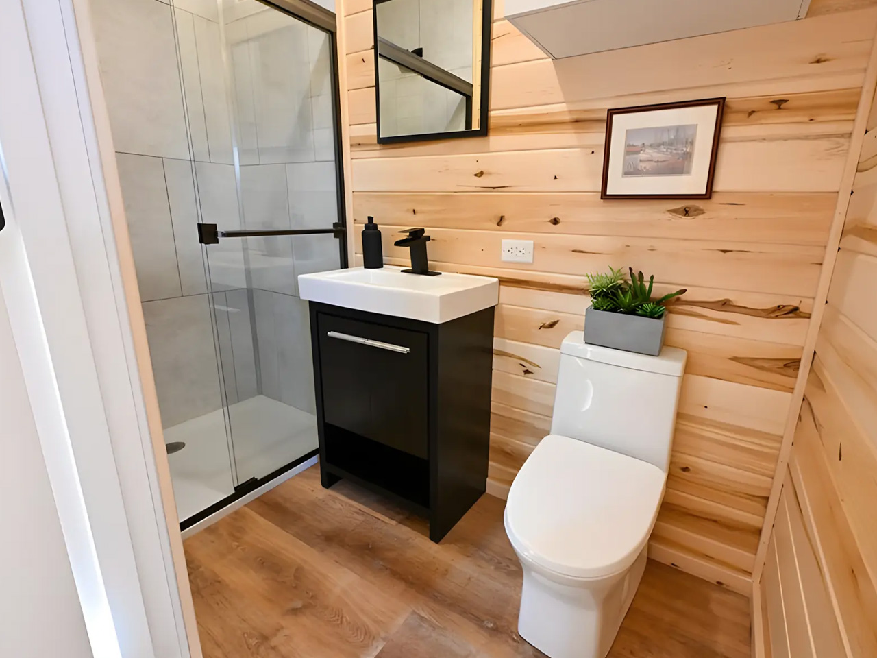 Located in another part of the tiny house is the bathroom, which is compact yet functional. The bathroom is quite snug, but it efficiently accommodates all the necessary amenities. It features a standard flushing toilet, and adjacent to the toilet is a sink. Completing the setup is a shower, designed to maximize the limited space.