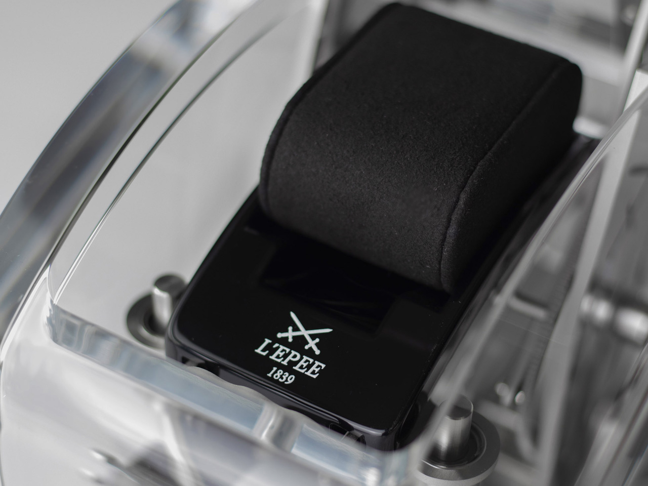 L’Epée Watch Box measures 215mm long, 150mm wide, and 140mm high. It is made from inox, acrylic glass and microfiber, and is hand-finished painstakingly with polished, satin and lacquer. The mechanical elements of the box are brass-plated supposedly. Owing to its construction it weighs 3.4 kg which is quite heavy.