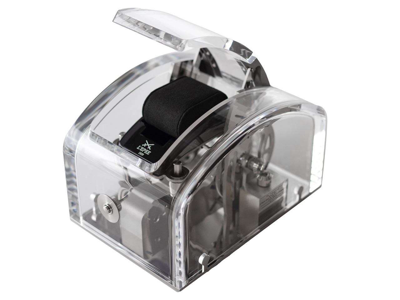 The watch box comes to life from a dull translucent container into a lively mechanical lift system with the push of a button on its acrylic housing. When the button is pushed, the mechanical system on the inside elegantly opens the top lid and lifts the watch-securing cushion up and out of the box. At this point, you can choose to remove the watch and wear, or push it back down when you’re down showing off.