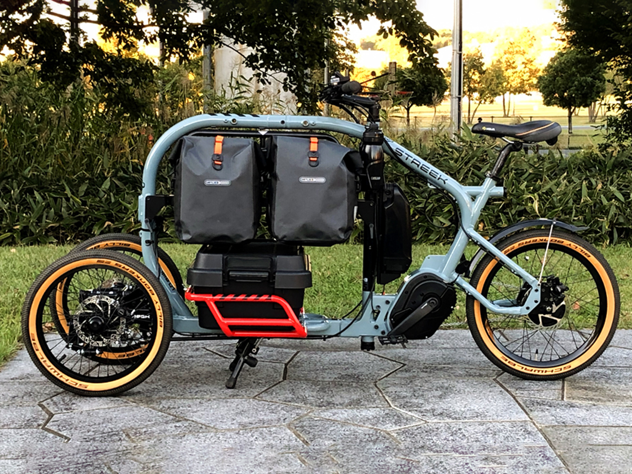 The Streek T5, developed by Japanese design firm Envision, is an innovative electric trike ideal for urban commuting. It offers a practical, compact design with a highly configurable cargo system, making it perfect for navigating busy city streets while carrying larger loads. Its two-level cargo sections, pannier options, and open-frame design provide ample storage space, ideal for high-traffic locations. The trike’s compact size (74.4 inches long x 23 inches wide) ensures maneuverability without sacrificing cargo capacity.