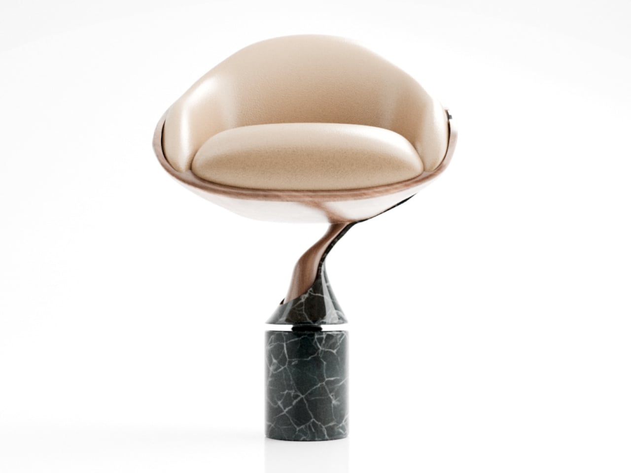 The chair features a marble base that begins as a cylinder and gracefully curves upward like a plant stem, while the wooden seat, naturally curved, appears as though it has been carved from a larger block, resembling stone. The result is a sophisticated chair that seems to grow organically, with its elegant and slender design concealing the robust stability provided by the intertwined marble and wood.