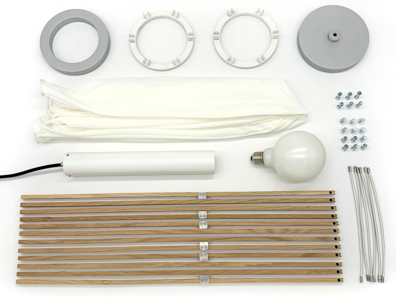 Crafted from warm-toned sanded oak, the chandelier’s structure creates a beautiful contrast with its off-white transparent mesh covering. This thoughtful material combination gives the lamp a weightless quality despite its substantial size when expanded. The horizontal patterns in the mesh diffuse the light beautifully, casting gentle shadows that add texture and depth to any space. The overall effect is one of airiness and approachability, a statement piece that doesn’t overwhelm its surroundings.