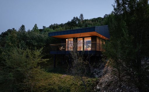 Entry to the Bellbird is through the porch and double glass sliding doors, leading directly into a bright kitchen filled with natural light from ample windows. The kitchen is equipped with a sink, a compact fridge, a microwave, and plenty of cabinetry and shelving for storage. There’s also a long drop-down table that doubles as a dining area or workspace. On the opposite side, the living and sleeping areas are combined. The featured model includes a sofa bed, making it comfortable for up to two people and maximizing the use of space for relaxation.