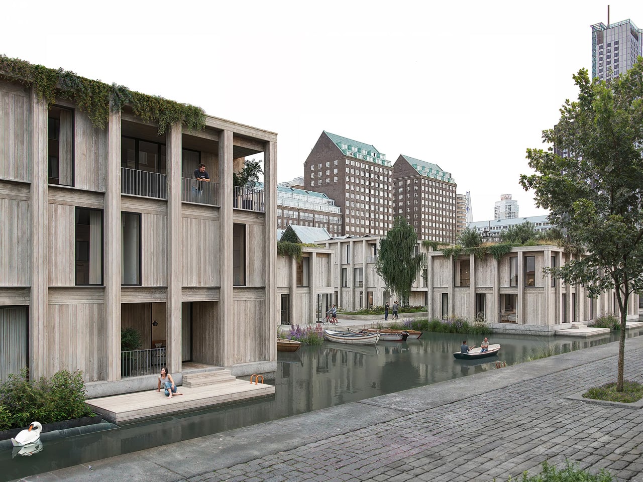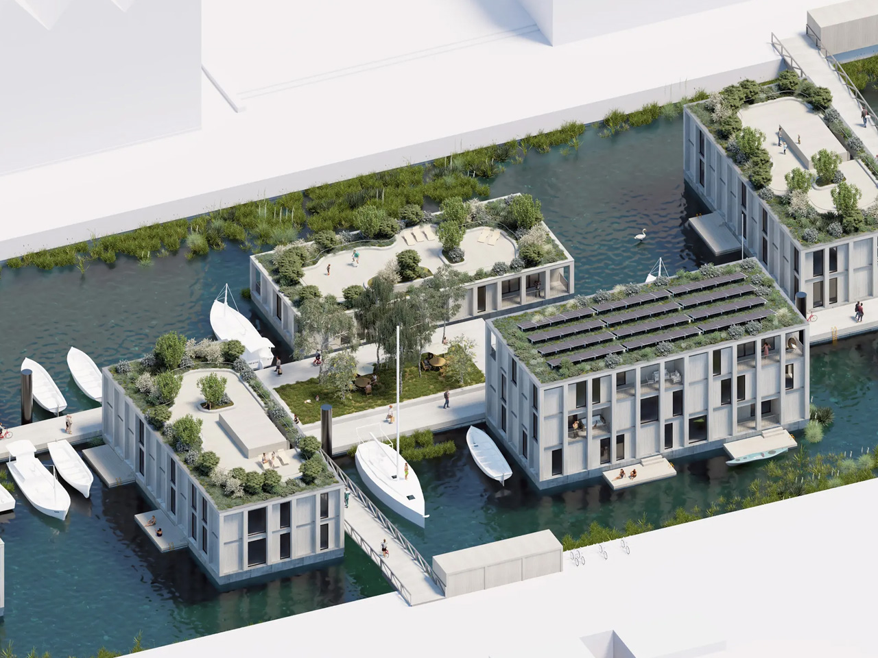 Spoorweghaven is designed to be porous, welcoming, and deeply connected to the city around it. Public walkways and cycle paths thread through the floating neighborhood, linking it to Rotterdam’s extensive bike network. Residents will glide from apartment to city center by bicycle, or step out onto communal terraces and rooftop gardens that offer both privacy and a sense of shared belonging. The floating moorings create pockets for recreation and social gathering, encouraging spontaneous encounters on water and land alike.
