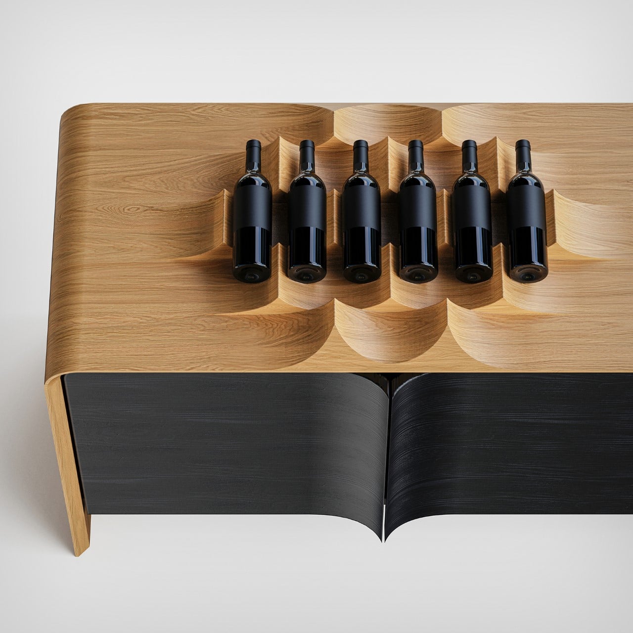 A particularly innovative element of the Genipabu Sideboard is its integrated wine storage. Set within a rhythmic triangular structure, the wine rack subtly echoes the dune’s natural peaks and valleys. This detail not only serves a practical purpose but also deepens the visual storytelling of the piece. By incorporating storage into the design’s aesthetic language, the sideboard maintains its sculptural presence without sacrificing usability.