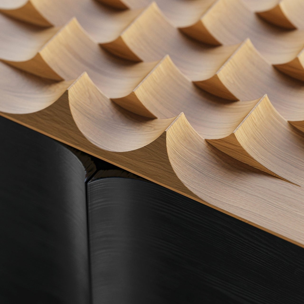 Crafted with sustainability in mind, the base structure of the sideboard is made from MDF and coated in natural wood veneers, providing strength and texture. The upper wine rack is CNC-machined, allowing for precision in the triangular pattern. Most notably, the external parts of the sideboard are made of certified solid wood, finished with a natural semi-gloss carnauba wax. Derived from the Carnaúba palm, this wax is a renewable resource, offering a durable, elegant finish that is both tactile and environmentally friendly.