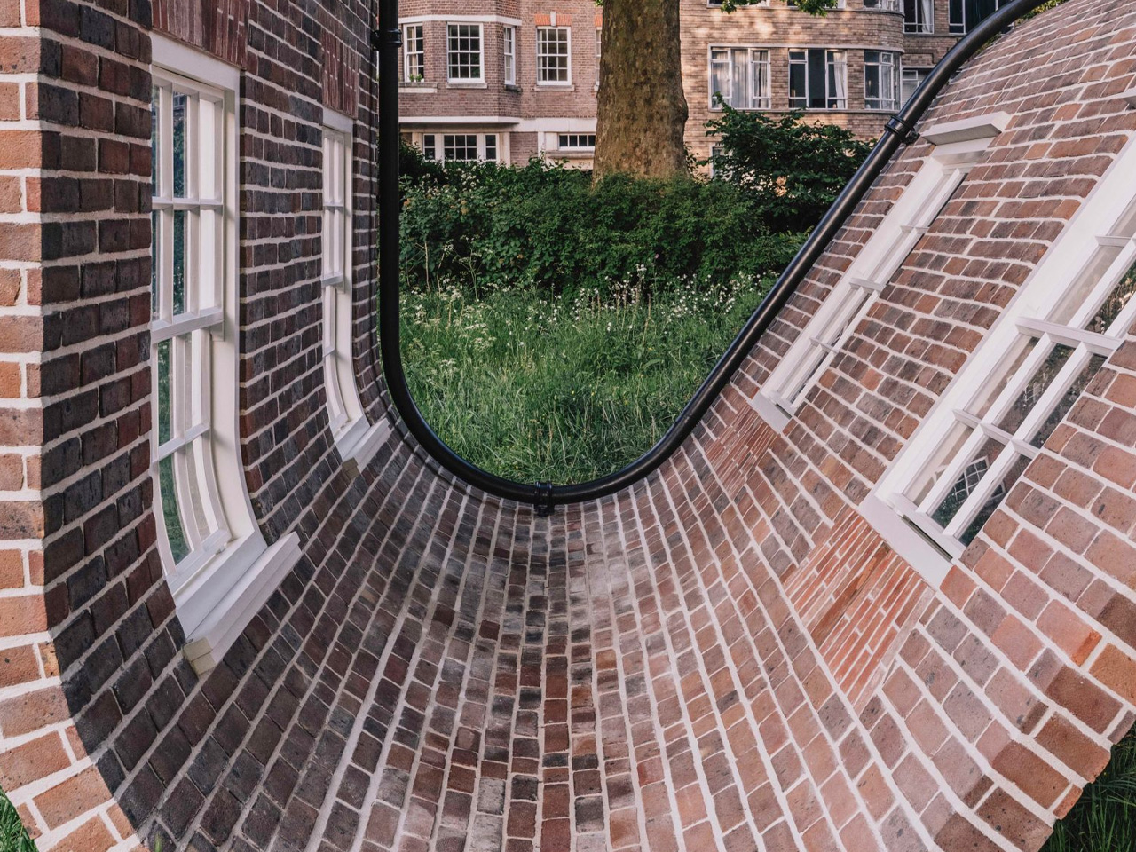 Chinneck’s sculpture stands over five meters tall and stretches more than thirteen meters wide, yet it feels approachable. The choice to echo the details of the surrounding Georgian architecture roots the work within its historic context. Brickwork, sash windows, and even cornices are reproduced with care, making the distortion of the building’s lower half feel all the more mischievous. From some angles, the illusion is so convincing that the facade almost seems to ripple like fabric, softening the expected rigidity of brick and mortar.