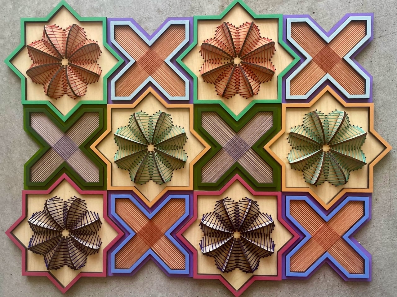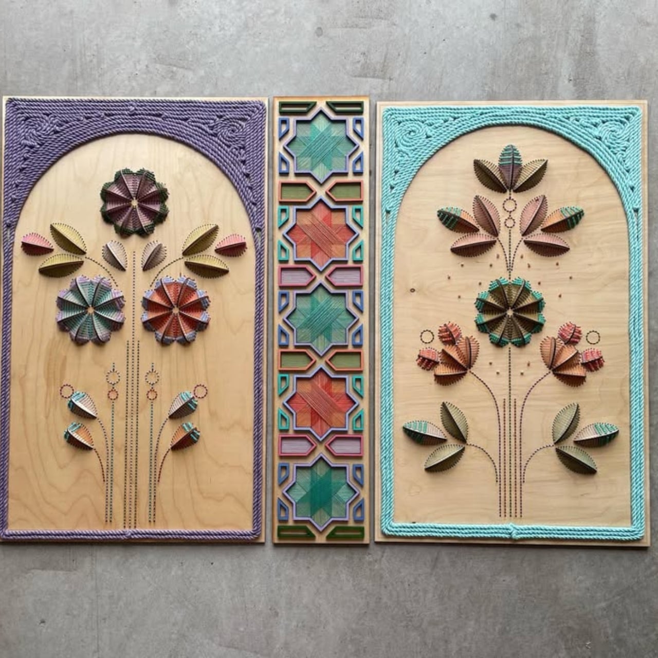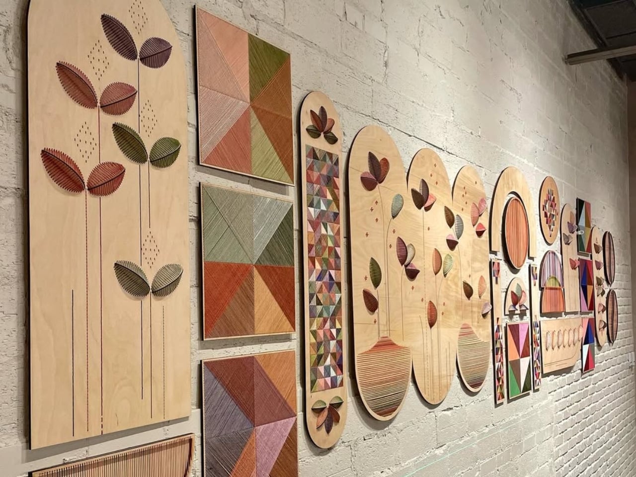 Botanical Allegory is one of Iqbal’s most evocative and visually stunning bodies of work. Here, she uses botanical motifs like leaves, vines, petals, and tendrils to explore themes of growth, transformation, and the cycles of nature. But these aren’t simply pretty plants; they’re carefully chosen symbols, each telling a layered story. In this series, Iqbal drills precise grids or organic patterns into wooden panels, then hand-embroiders vibrant threads through the holes. The result is a three-dimensional artwork where the softness of thread and the solidity of wood create a harmonious tension. The botanical forms seem to grow from the wood itself, as if nature is reclaiming and transforming the surface.