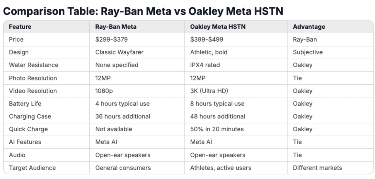 - Performance Leader: Oakley Meta HSTN with 3K video (vs 1080p) and double the battery life (8 hours vs4)