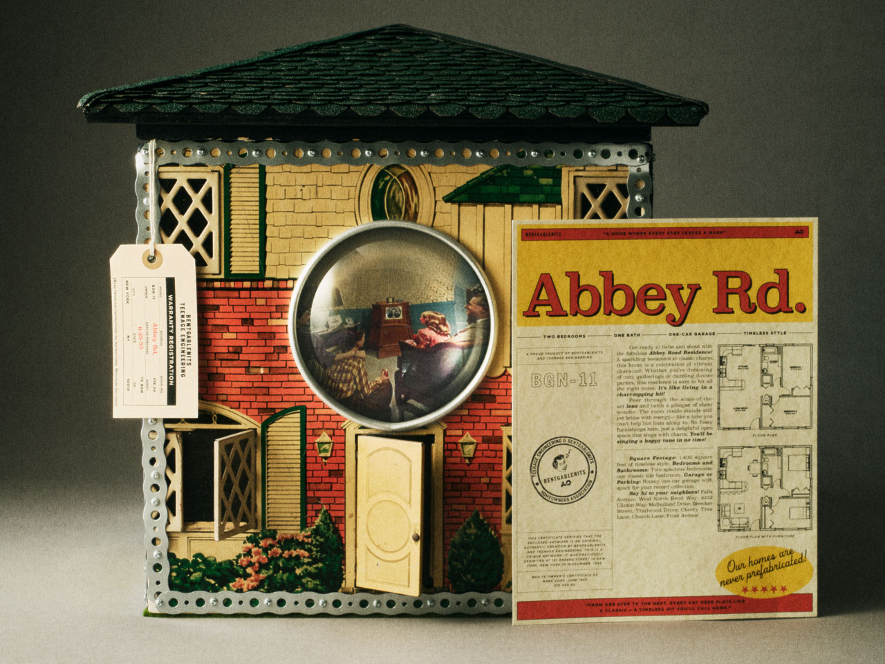 Dubbed BGN 11, this latest endeavor transforms a row of ten vintage tin dollhouses into bespoke audio sculptures, each housing a working TE OD-11 speaker within its hand-altered walls. Partnering with Toronto-based craft collective Bentgablenits and powered by Shopify’s creative space in Soho, New York, the installation reimagines mid-century Americana through the lens of sound, memory, and technology.