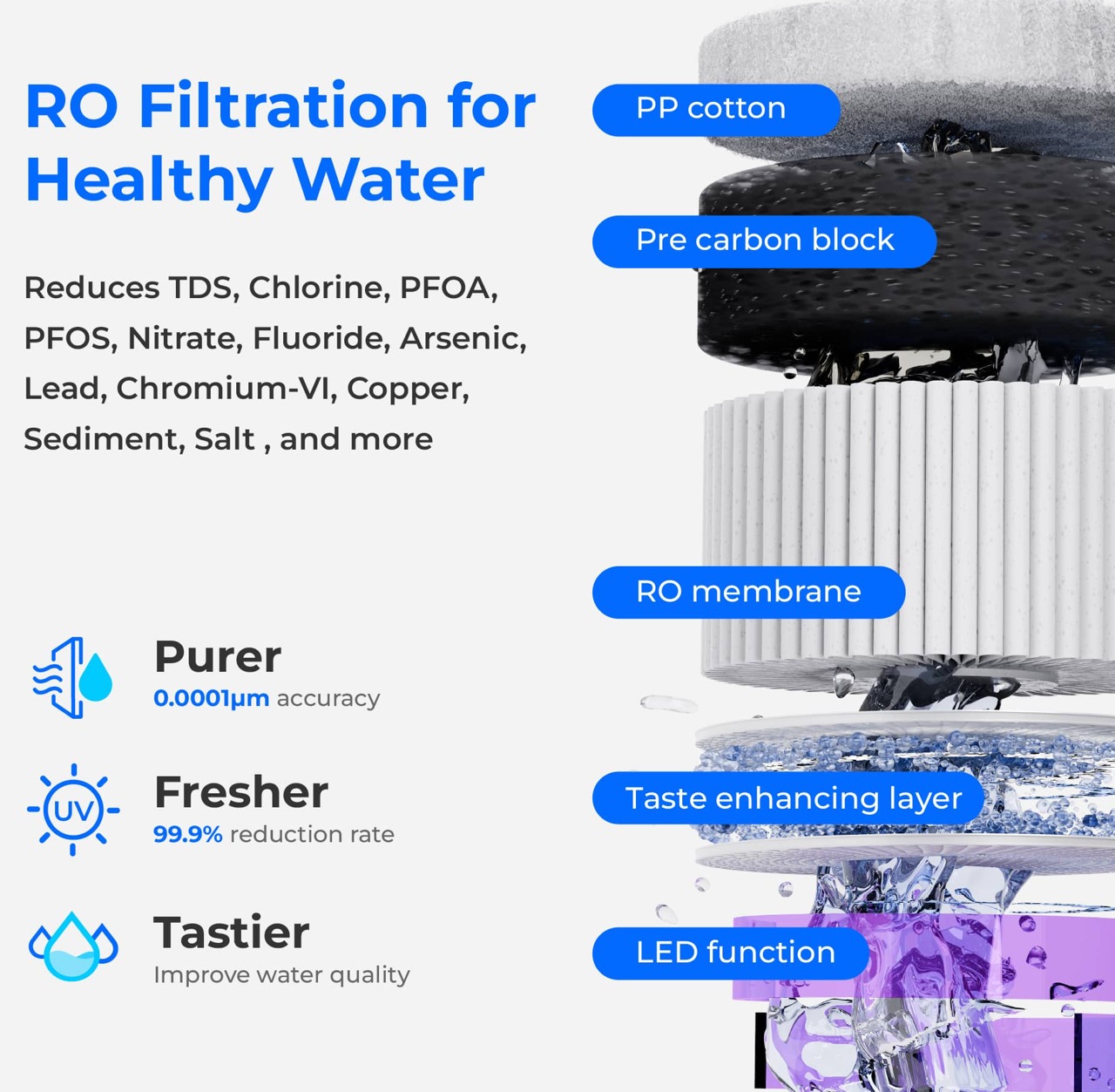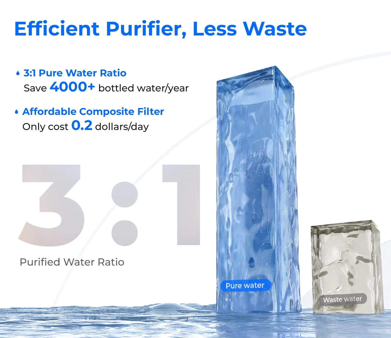 - Effective 5-stage filtration and efficient 3:1 pure-to-drain ratio