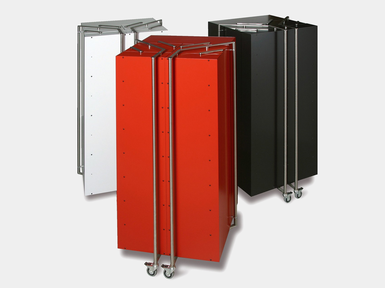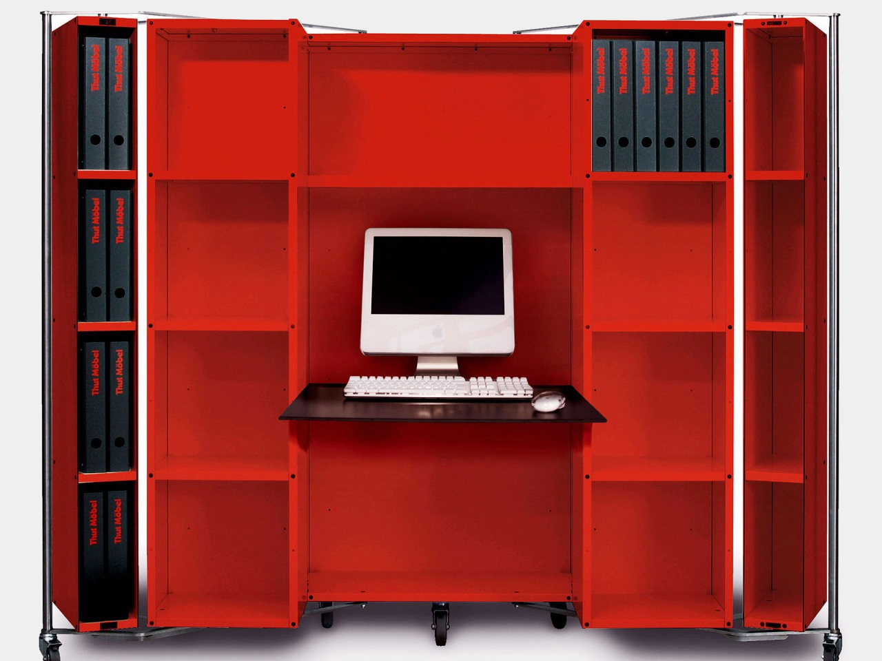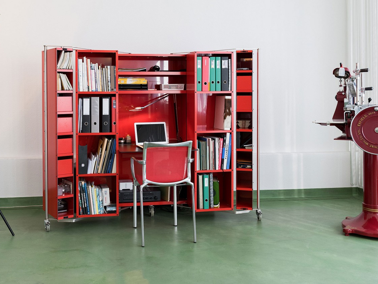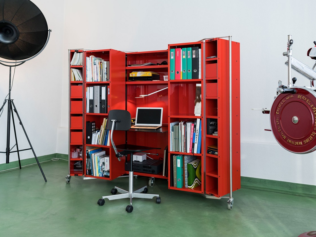 The Tool Cabinet 490 is a multifunctional storage solution inspired by the efficient design of the classic bi-level toolbox. Crafted for modern living and compact spaces, this cabinet transforms to serve both as a practical workstation and a spacious organizer. Its innovative structure features side-opening doors that reveal two tiers of shelving, offering ample room for books, files, clothing, or personal items. The central section adapts as needed, serving as a fold-out desk for remote work or a traditional wardrobe with hanging space and shelves. When not in use, the entire unit folds neatly away, keeping clutter out of sight.