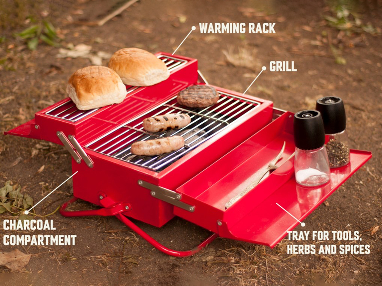 Thoughtfully designed, the BBQ Toolbox includes storage racks for spices, herbs, and condiments, along with a dedicated platform for grilling tools like spatulas or skewers. Easy to clean and transport, the unit folds back into its compact, toolbox-like shape once the meal is over.
