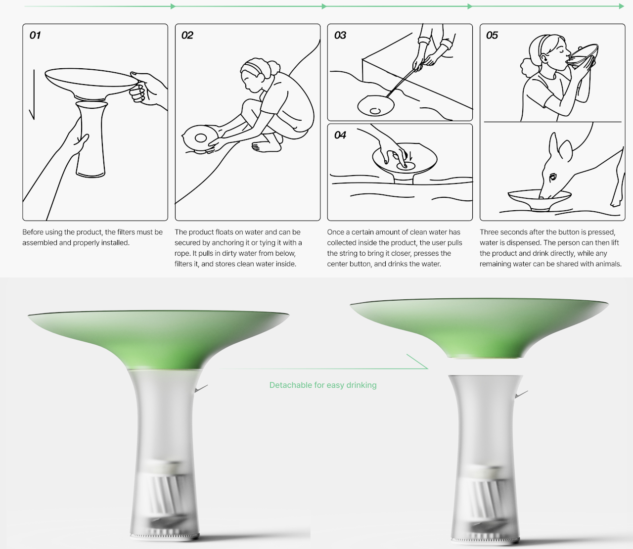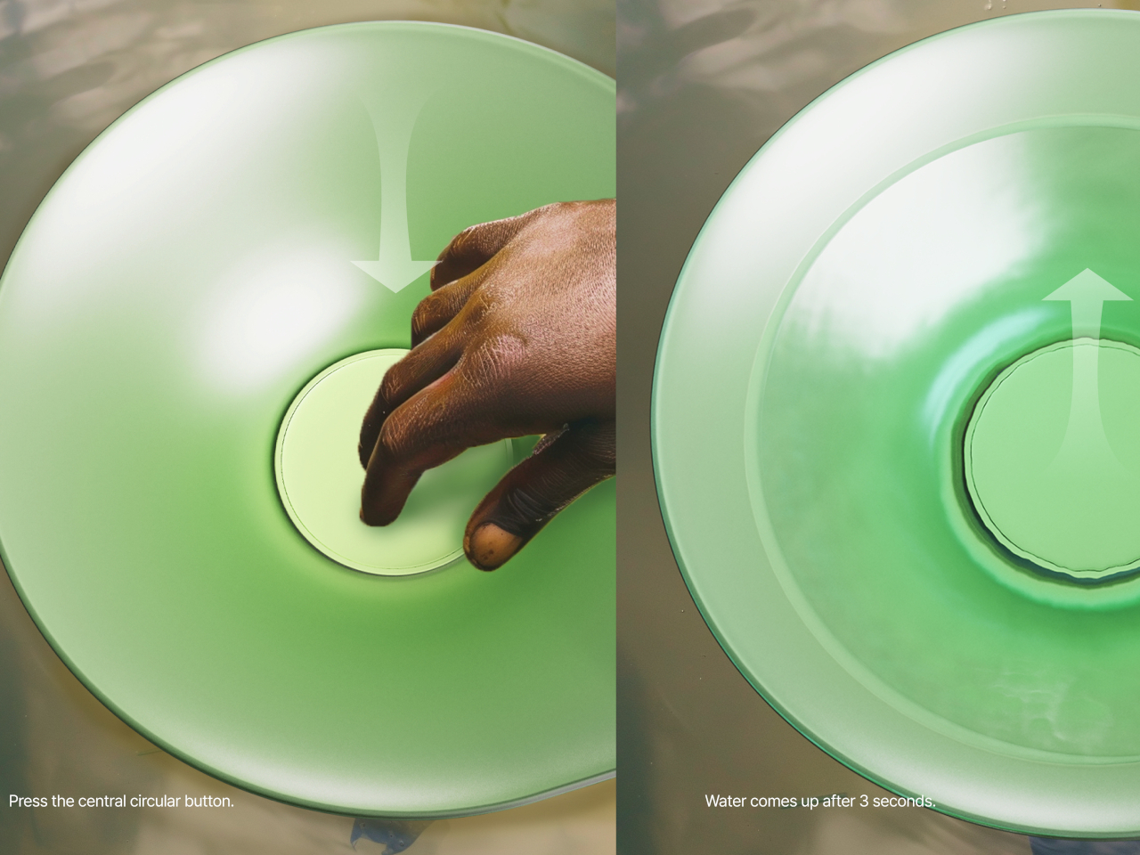 Floatis consists of two main parts: a wide, green bowl that floats like a lotus leaf, and a cylindrical purifier hidden beneath the surface. When placed in stagnant water and anchored or tied to shore, the device draws in dirty water from below. The process is simple: once the device has filled its internal reservoir, you press the center of the bowl and, after a short wait, clean water fills the top container, ready for drinking or sharing with animals.