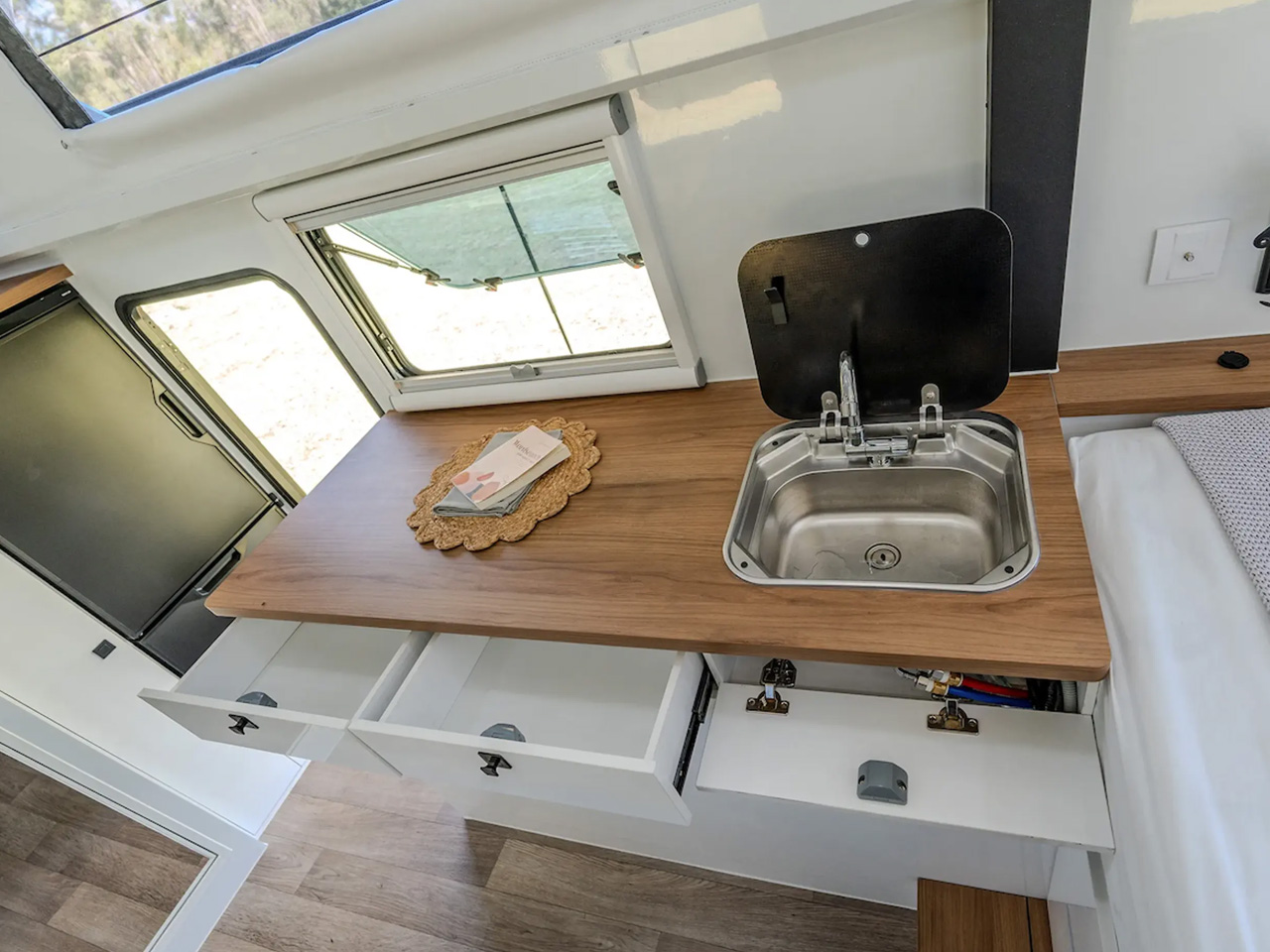 The Iconn E4 XK kitchen comprises four large compartments that occupy the entire single side wall of the trailer. The two main compartments directly in front of the entrance door contain the induction cooktop and the sink alongside a wooden cutting board. Overhead storage fills the space above the countertop, while the adjacent 40-L EvaKool drawer fridge offers additional workspace on top. There is additional storage space both under and above the long counter, which accommodates the electrical system and also makes room for the washing machine. Interestingly, an additional 175L fridge and freezer combo resides just inside the entrance so it’s accessible from the outside as well.