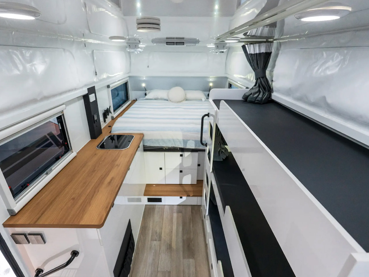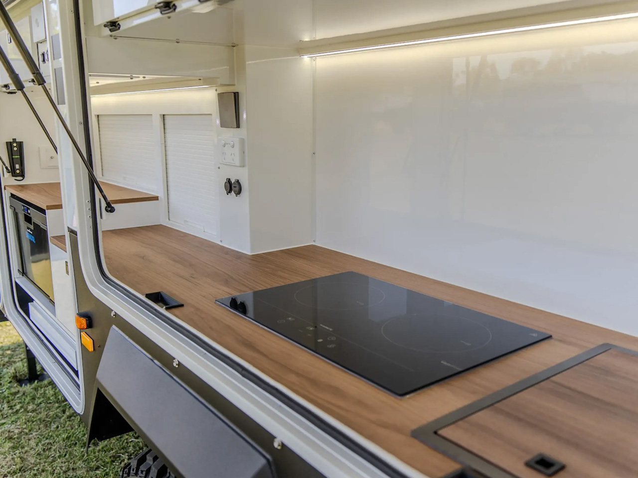 Iconn E4 XK distinguishes itself from other trailers on two accounts. Its layout adaptability to user requirements, and an external kitchen with access to the gourmet-level kitchen inside, which spans almost the entire side of the camper. The industry-defining kitchen makes this a wholesome facility on wheels you would want to cook and live in as a family.