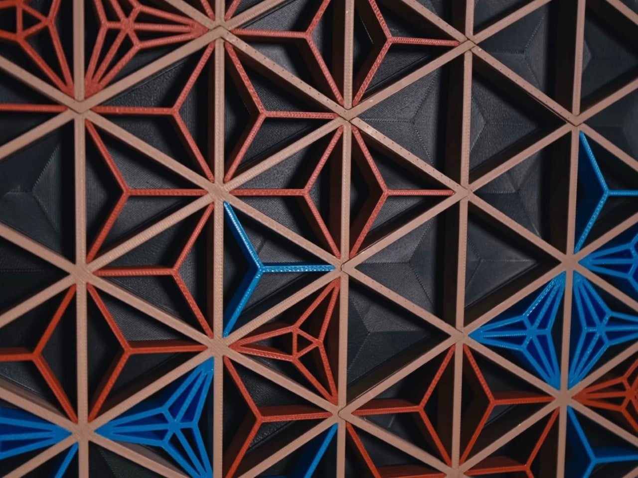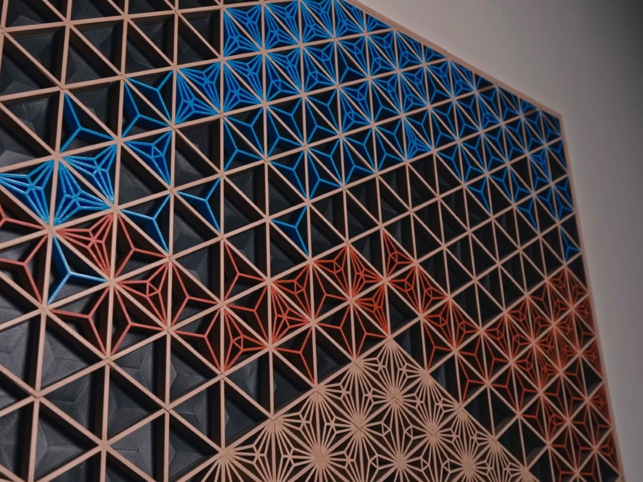The finished panel looks like a sci-fi portal that wandered through Kyoto. Triangles stack into hexagons, hexagons lock into a field, and a trio of colors pops against a matte black backing. Underneath the gloss sits a spreadsheet of numbers: 48 core panels, 32 inner borders, 32 outer borders, 124 seam covers, and a wild 1,028 patterned inserts. Add 1,650 black backplates, and the printer clock stops at 196 hours with 5,150 grams of filament spent. Material cost hovers near 100 dollars, proof that patience sometimes beats cash.