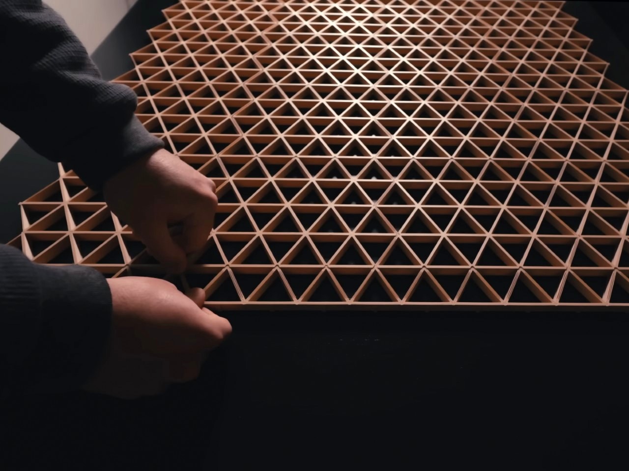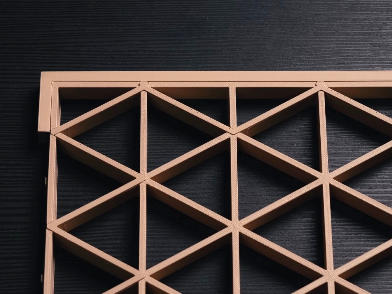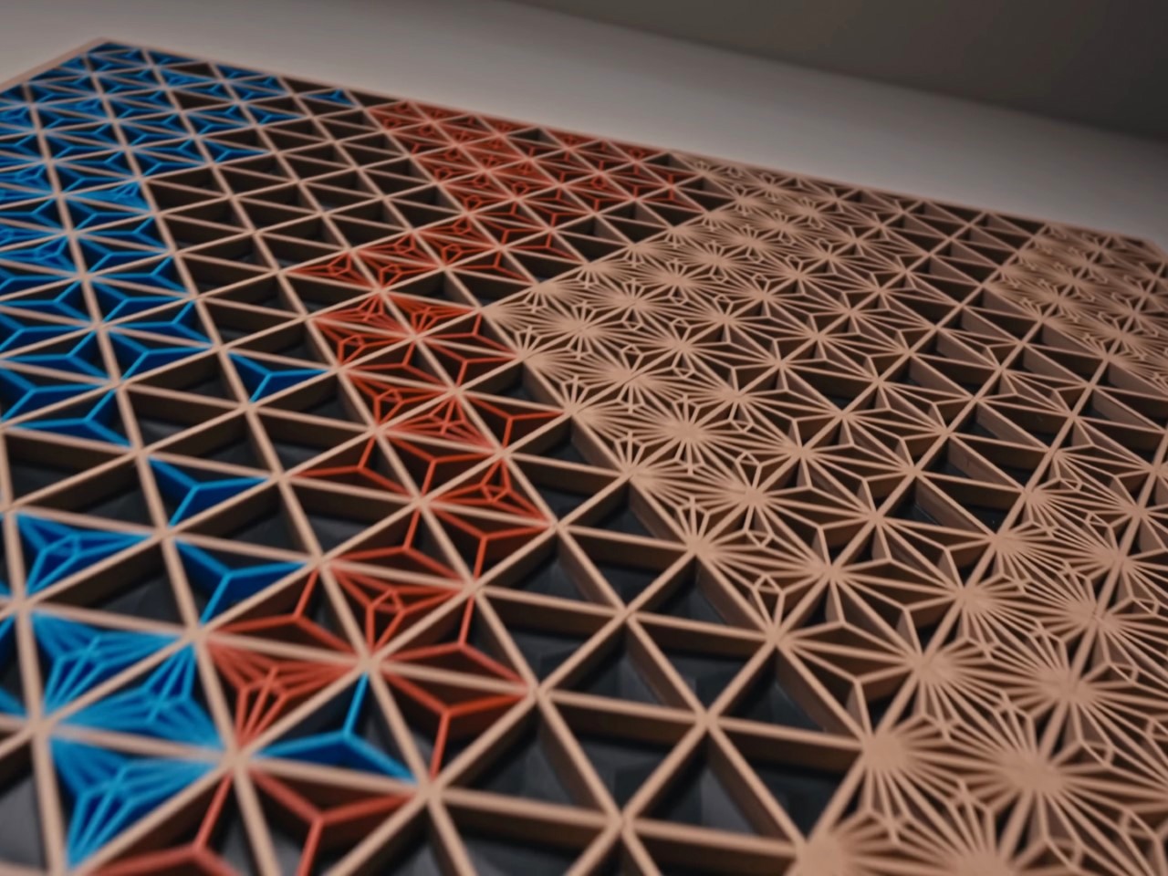 Seams still bothered him. Both woodworkers and cosplayers know that rule #1 of photo day is hiding the line. Rather than slog through sanding and filler, he modeled shallow pockets at every butt joint, then printed thin cover plates that press-fit like sticker tattoos. A final border ring holds sneaky dovetails, so the lattice floats inside a picture frame with only pencil-thin shadows hinting at the joins. Up close, you watch colors melt into a continuous weave; step back, and the eye forgets plastic entirely, reading depth instead of seams.
