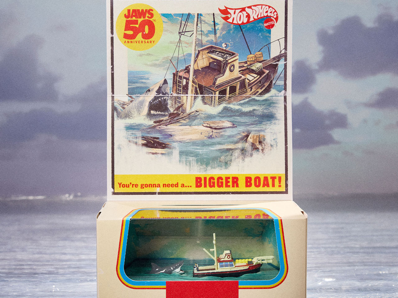 This diorama recreates the scene in the water, where the elements can be taken out or placed in the desired place. The set is packaged in a period-correct color scheme and can be opened up by flipping the outer flaps. The Hot Wheels 50th Anniversary Jaws set will also be up for grabs for a price tag of $32. Collectors better get their hands on this one.