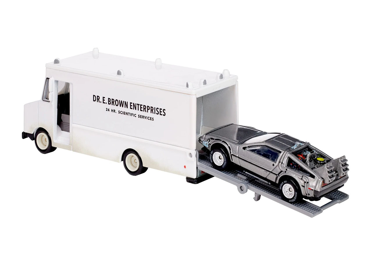 Attention to detail is paramount here as the interior window packaging shows off the Twin Pines mall parking lot scene – scene-the same place where Doc’s science experiment turns into a time-traveling odyssey. The DeLorean gets the signature rear-mounted vents, gull-winged doors, flux capacitor and plutonium-fueled nuclear reactor to complete the intriguing details. Both the Time Machine and the DeLorean feature a die-cast construction and Real Riders wheels. This set with both vehicles will be priced at $32, which makes it a must-have for collectors.