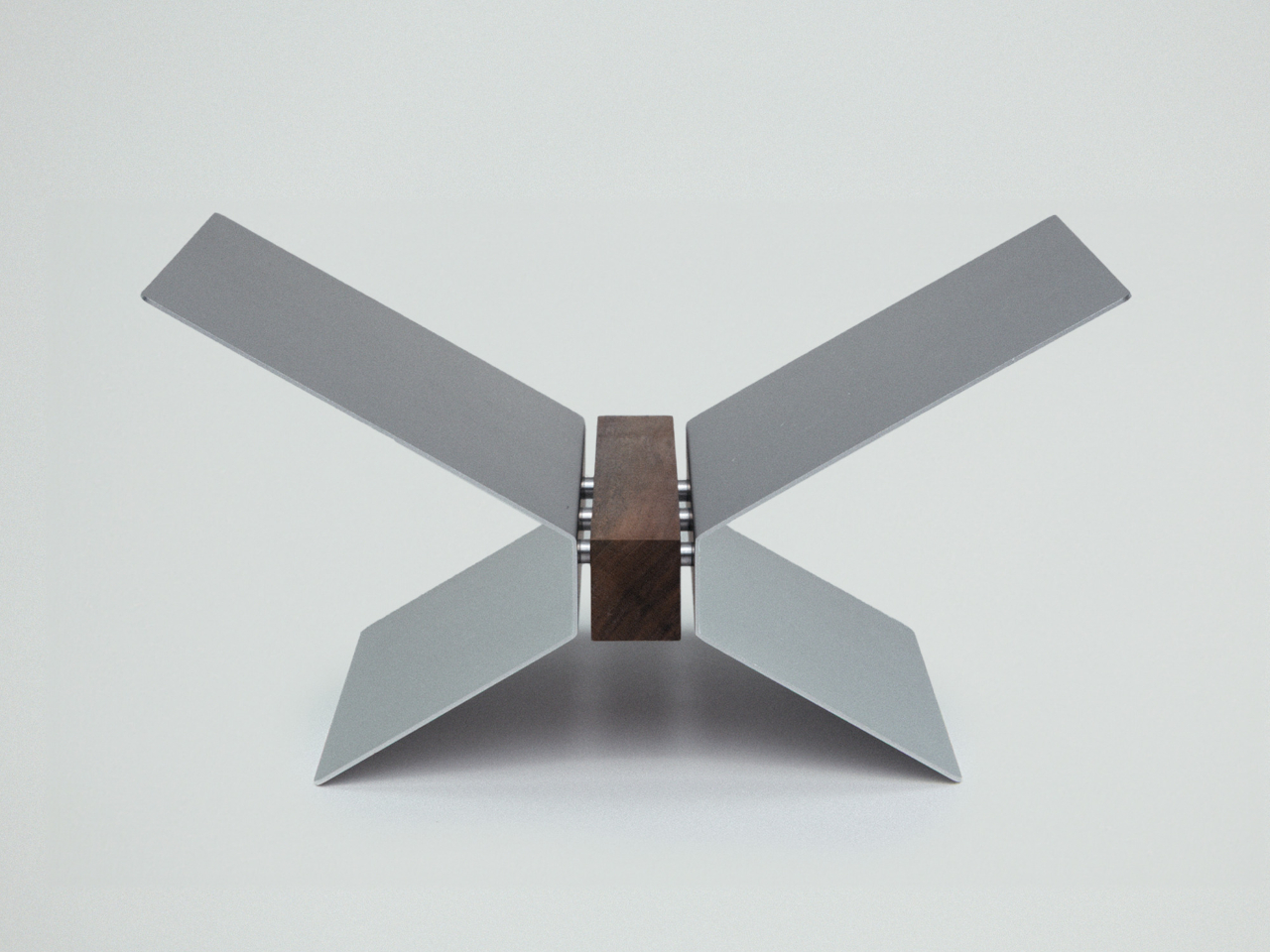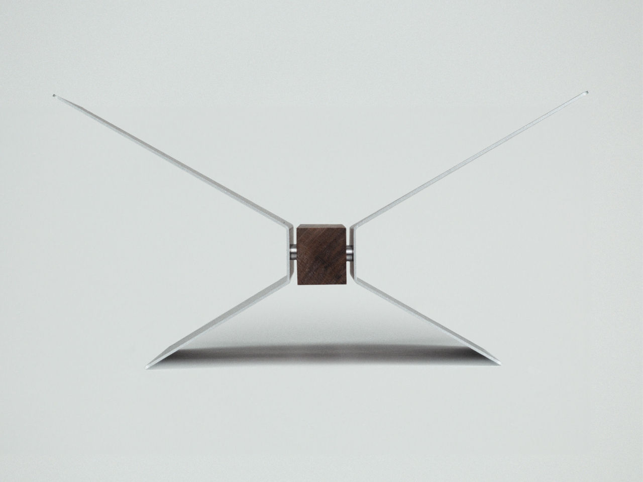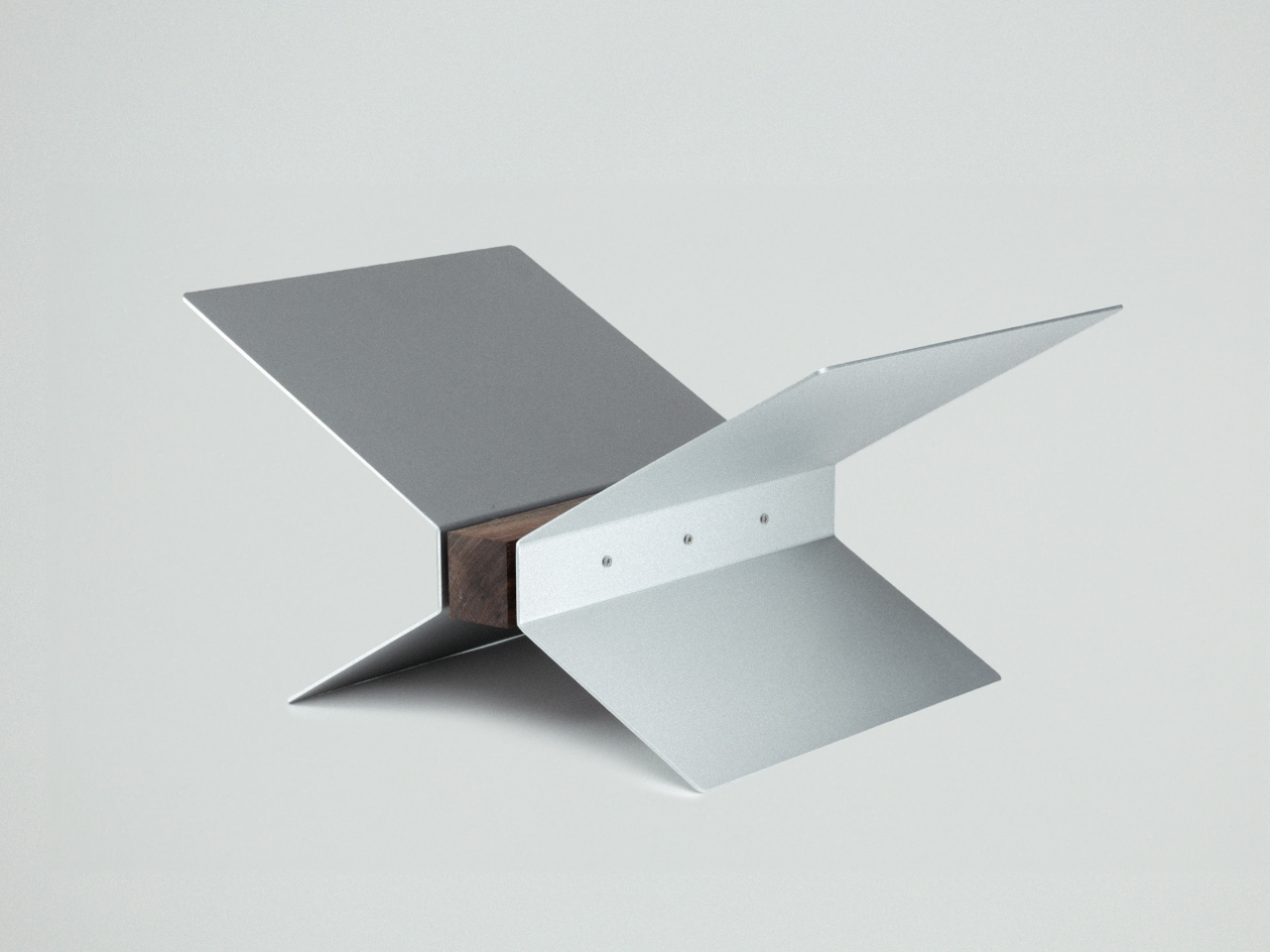 What makes this piece especially intriguing is how the main elements come together. The aluminum wings and the walnut center are held in place only by custom-molded separation bolts, keeping the construction clean and the design honest. There are no hidden fasteners or unnecessary decoration; the hardware itself becomes part of the aesthetic, adding to the sense that each decision is carefully considered rather than just practical.