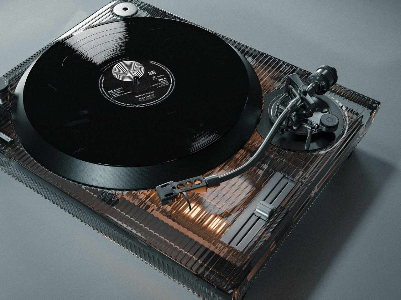 This vinyl player is an ode to light and glass. Inspired by ribbed glass and the way it refracts light, the player’s transparent base turns every record session into an interplay of shadow and illumination. The glass grills let you glimpse the spinning mechanics inside, while subtle lighting transforms the turntable into a glowing centerpiece.