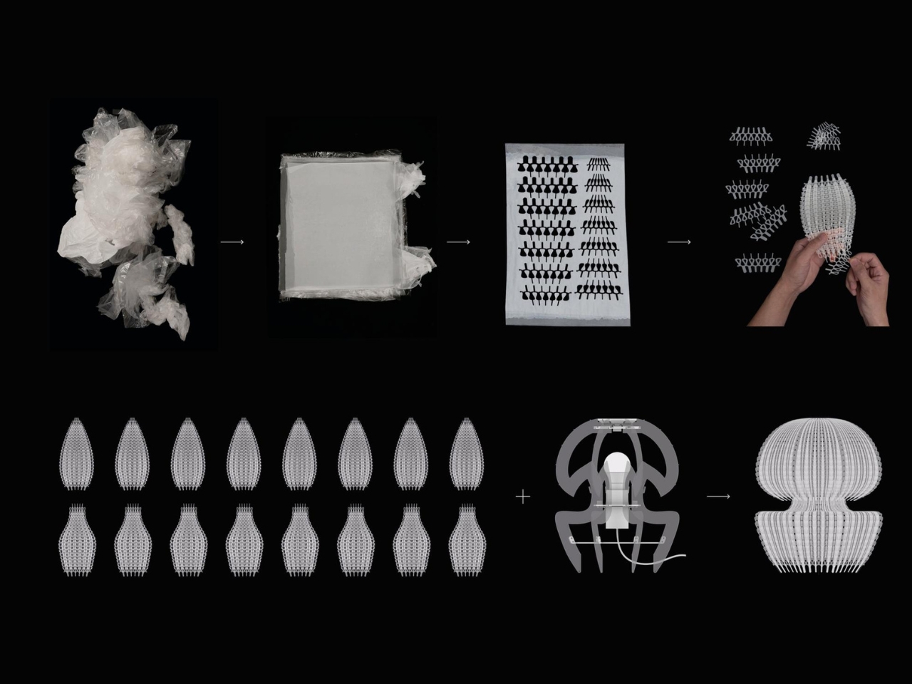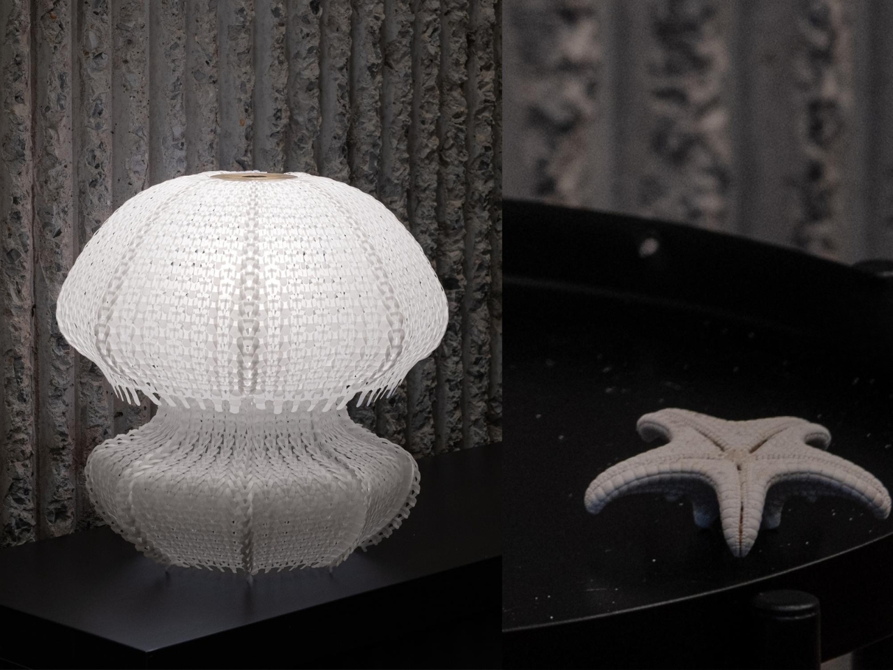 The magic of Polycycle Illumination starts with its jellyfish-inspired silhouette. Each lampshade is modeled using advanced parametric design, with original algorithms generating soft, floating forms reminiscent of jellyfish. Of course, these are the very creatures threatened by plastic pollution. The lampshades are made from knitted, interlocking units that are both flattenable and strong, blending computational precision with hand-assembled artistry.