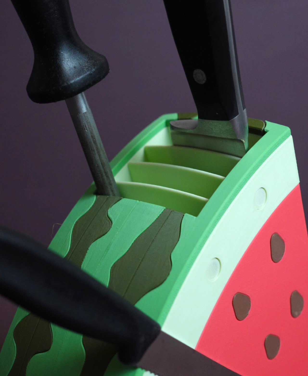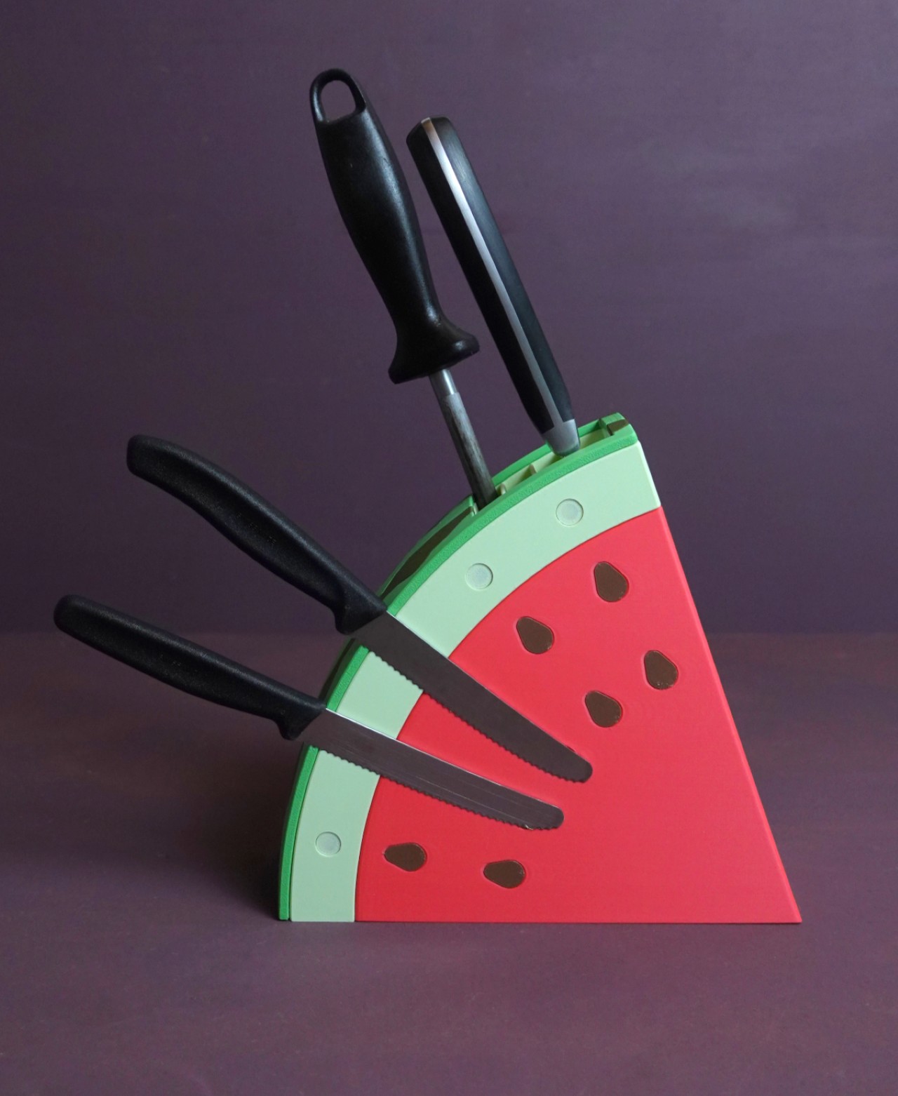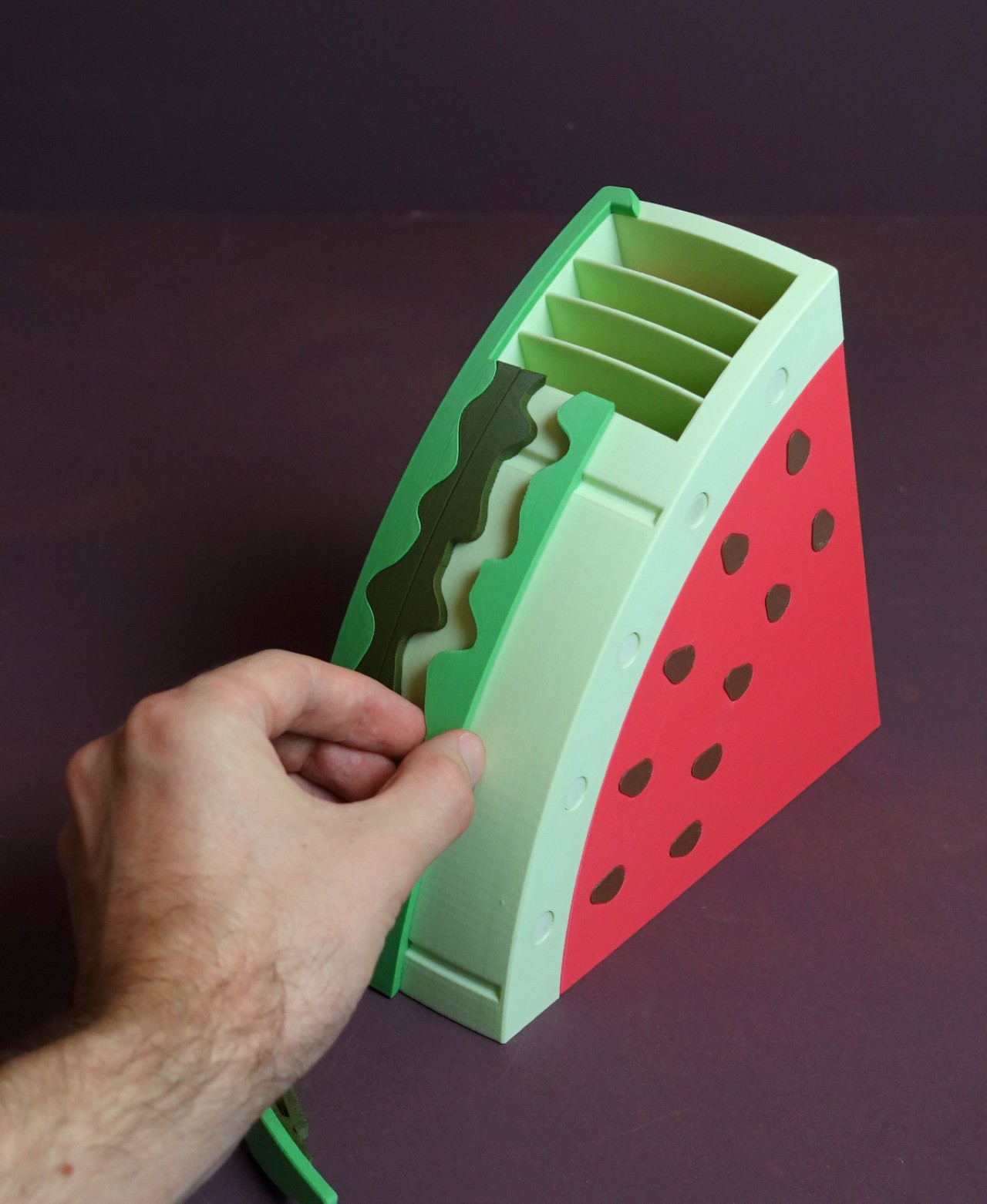 The magic, however, is in the magnetic knife rack on the side. The print file comes with hidden slots to mount magnets into, as well as parts that conceal the magnets so you’re left with illusion and mystery. The rind holds a few magnets, as does the flesh. Smaller pieces (like the seeds) then go on top of the magnets, hiding them from plain sight. The result is magnetic adherence without any obviously visible magnets. The block holds up to 5 knives per side, although I’d probably just keep the one side magnetic so that the other side can show off the watermelon’s design without getting obscured by knives. Besides, anyone who has more than 10 knives in their kitchen might need to re-evaluate their life choices.