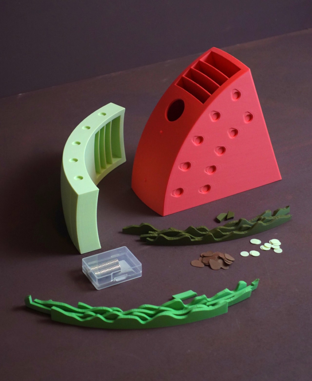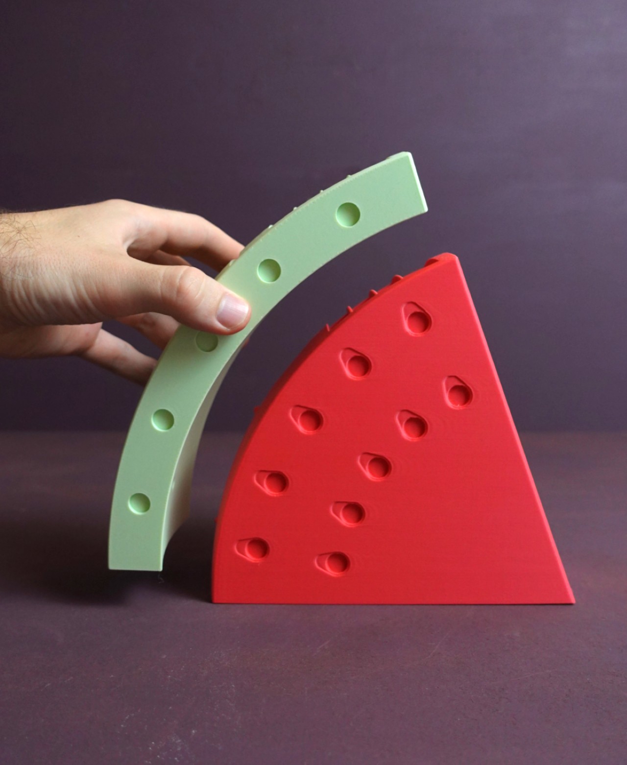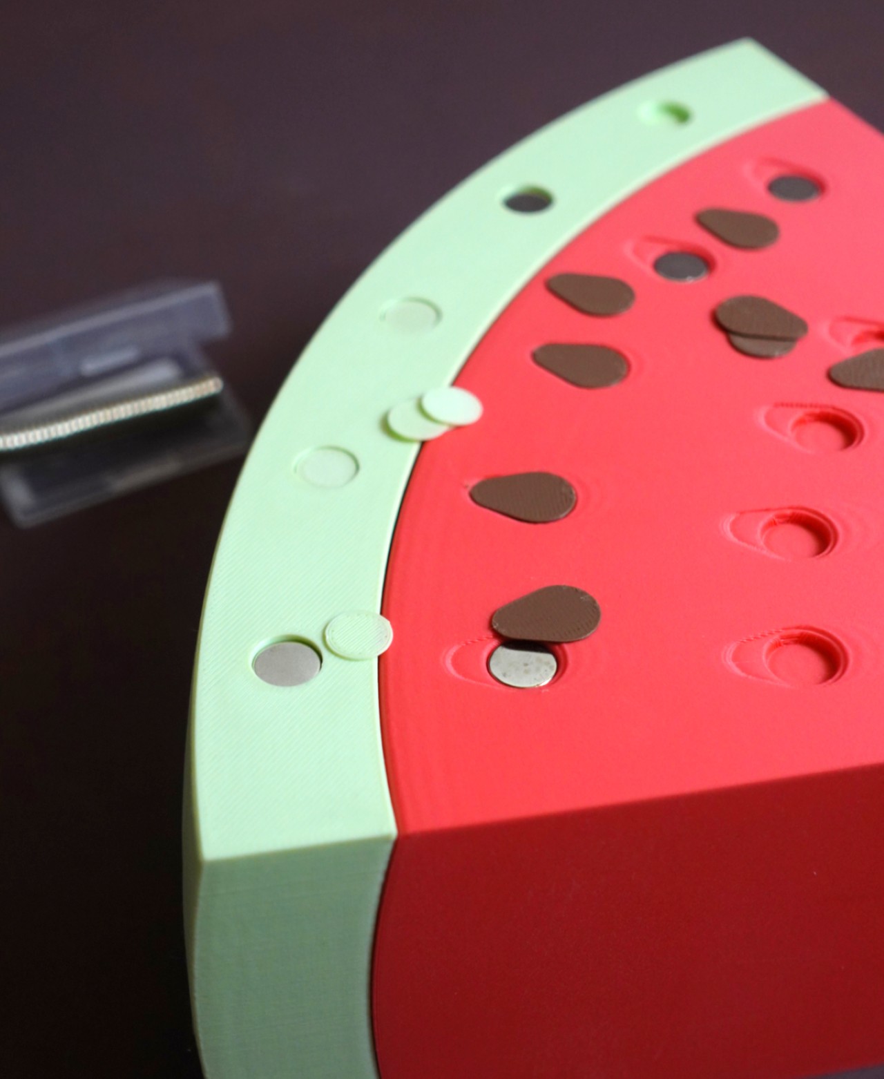 The magic, however, is in the magnetic knife rack on the side. The print file comes with hidden slots to mount magnets into, as well as parts that conceal the magnets so you’re left with illusion and mystery. The rind holds a few magnets, as does the flesh. Smaller pieces (like the seeds) then go on top of the magnets, hiding them from plain sight. The result is magnetic adherence without any obviously visible magnets. The block holds up to 5 knives per side, although I’d probably just keep the one side magnetic so that the other side can show off the watermelon’s design without getting obscured by knives. Besides, anyone who has more than 10 knives in their kitchen might need to re-evaluate their life choices.