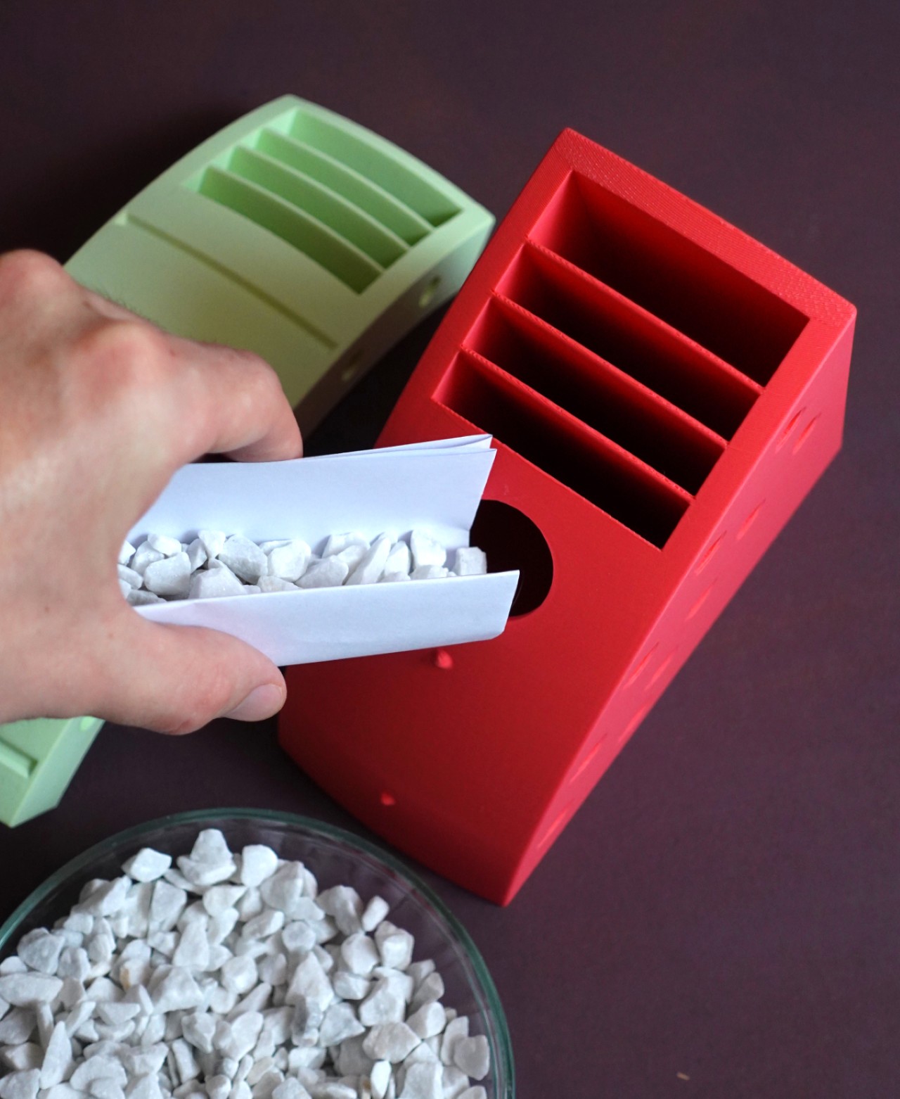 The block’s four slots are for either chunky knives like the thick chef knife or your large bread knife, as well as for peelers, honing rods, etc. Gazzaladra fills the inside with stone chips that give the block weight, while also allowing the water to drip dry naturally without creating a puddle inside the block or on your countertop. This, obviously, gets added later, after printing.