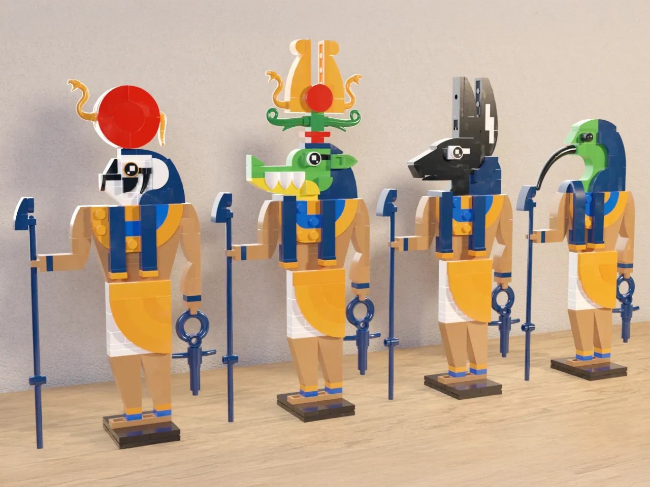 Color choices throughout are spot-on for anyone familiar with Egyptian art. The tan bodies, blue and gold regalia, and strategic pops of color mirror the pigments you’d find in actual tomb paintings. Each god stands on a simple brown base that provides stability without distracting from the figures themselves. The whole collection strikes that perfect balance between display piece and playful LEGO character that makes the best Ideas sets so appealing. If this submission reaches 10,000 votes, LEGO would be crazy not to give these gods the official treatment they deserve.