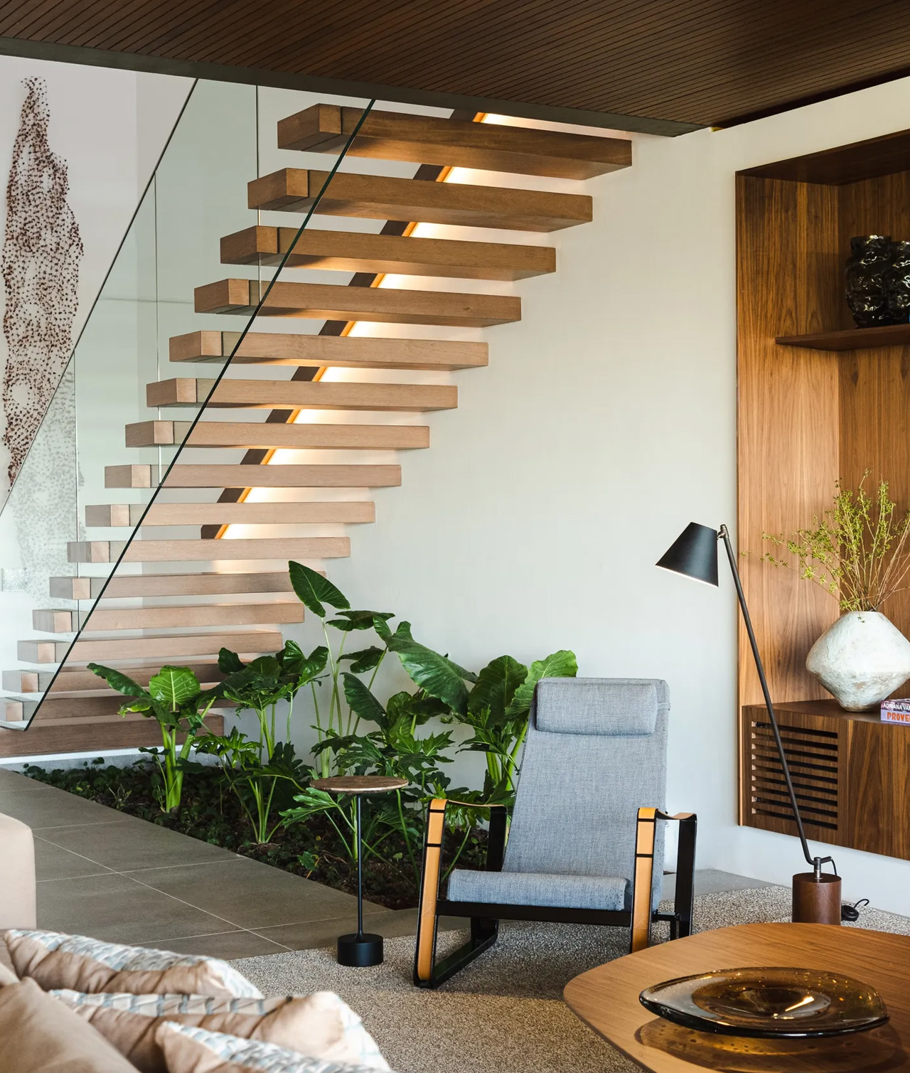 Light becomes a defining architectural element throughout the residence. The north-facing garden orientation floods interior spaces with consistent, quality illumination that changes character throughout the day. Strategic window placement frames specific views while controlling privacy levels. The relationship between built form and landscape creates dynamic shadow patterns that animate interior walls. The flow of natural light reduces dependence on artificial illumination while creating spaces that feel alive and connected to their surroundings.