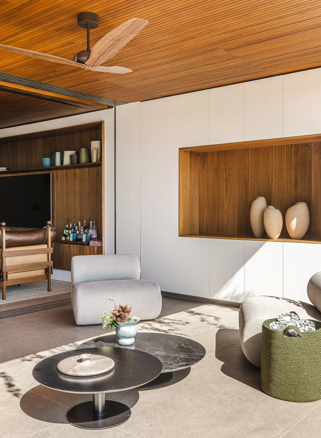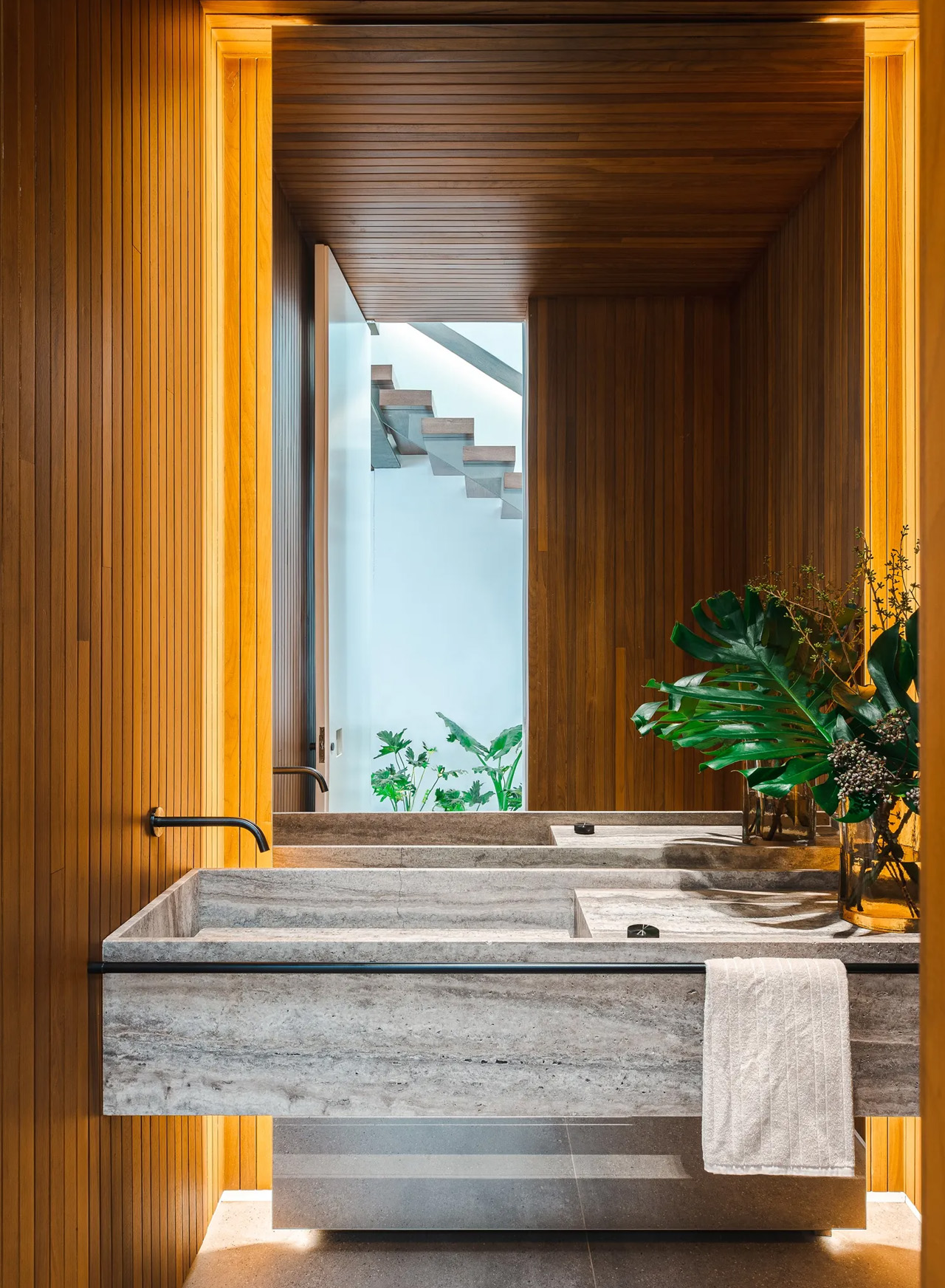 Wood-clad surfaces create warmth and texture, evident in the ground-floor bathroom that functions as a serene sanctuary. The interplay between natural materials and clean architectural lines establishes a sophisticated palette that feels both timeless and distinctly modern. Stone elements provide grounding weight, while expansive glass planes dissolve boundaries between interior and exterior spaces.