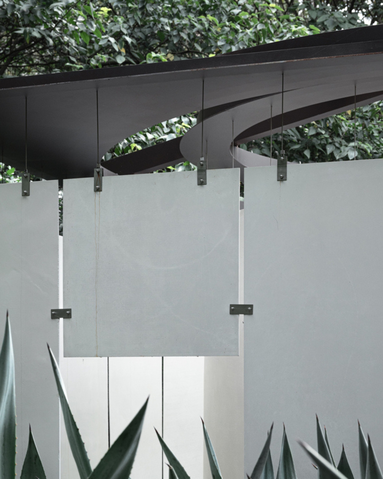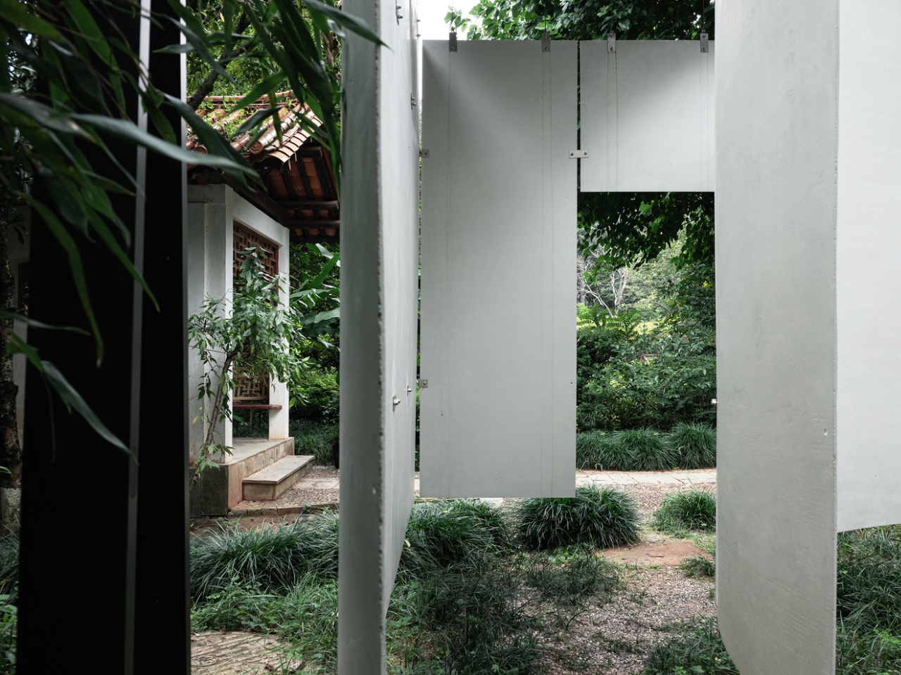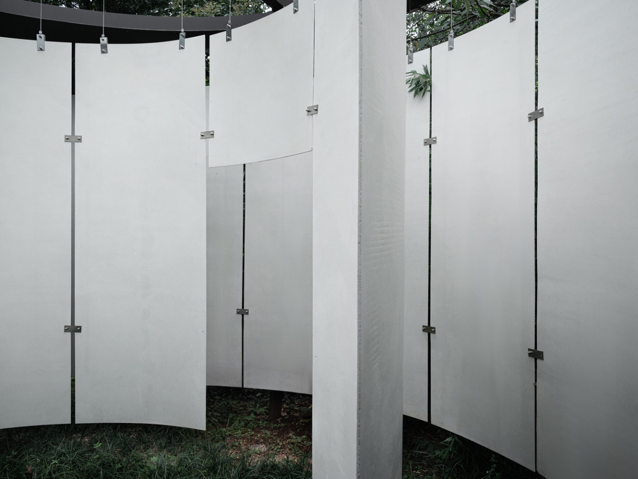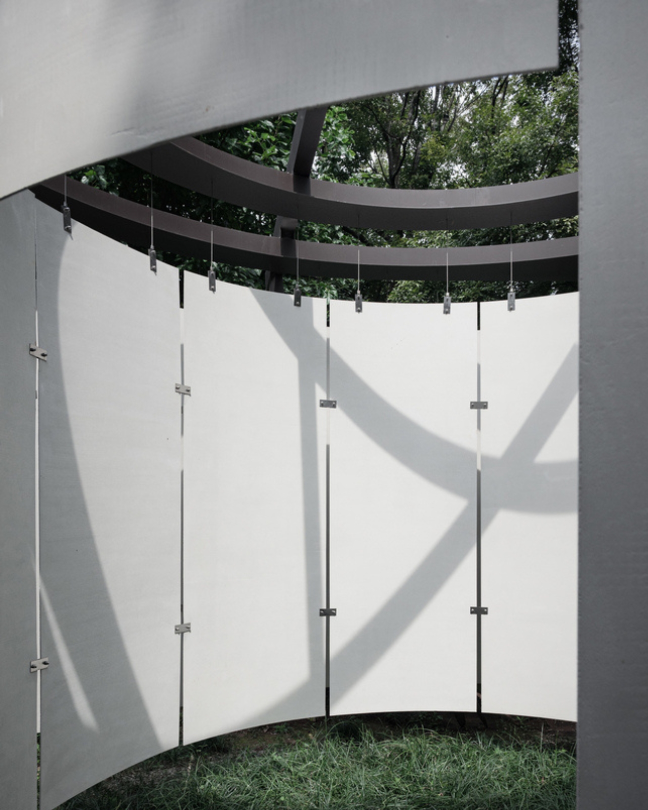 A moment of surprise awaits as you step into the pavilion’s core. What was thick and substantial suddenly gives way to thinness and light. Atelier Guo experimented with ultra-thin precast white concrete panels to create suspended walls that balance structural stability with a sense of visual delicacy. The panels’ subtle reflectivity and the soft play of shadows across their curved surfaces give the form a gentle resilience. Against the backdrop of lush greenery, these walls act like screens, catching the light and projecting the landscape as if it were ink-washed silk.