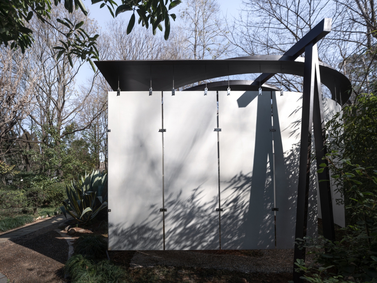 Within this compact footprint, the elongated corridor amplifies the senses, turning each step into a moment of spatial discovery. As visitors move through the garden, fragmented glimpses and shifting perspectives merge into a unified, immersive experience. Rather than simply creating a pavilion or an extended wall, Atelier Guo approached the project with a light touch, using minimal foundations and a top-down logic. The design maintains the layered feel of the existing pavilions but gives special emphasis to the wall as a defining element. Here, the wall, roof, and ground are clearly distinct from one another. The roof itself is not a solid surface but a structural framework, with shallow eaves that soften the intersections and frame the garden with crisp, upright corners. This approach allows the pavilion to oscillate between the feel of a sculptural installation and a traditional built structure.