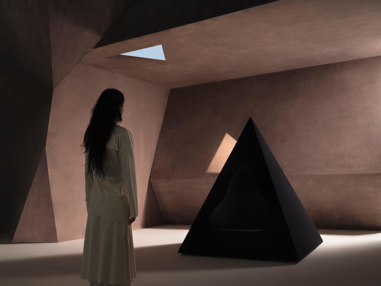Domain Architects looked to natural cave formations for inspiration, translating the protective qualities of these ancient shelters into contemporary furniture design. The result is a geometric pyramid that functions as both seating and architectural enclosure, creating what the designers call a micro-space for retreat and reflection.