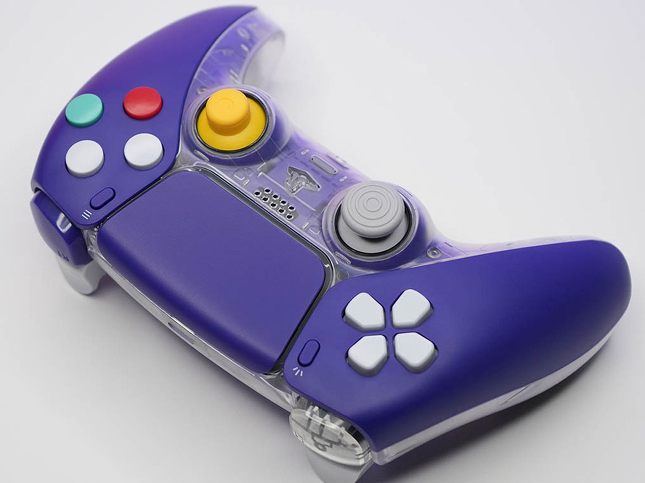 The CubeSense controller cleverly merges Nintendo GameCube nostalgia with modern PlayStation functionality, creating a bridge between gaming generations. The matte purple front shell paired with a transparent back directly references the beloved GameCube aesthetic while maintaining contemporary ergonomics. Red, green, and light gray face buttons evoke the playful color palette that made the original GameCube so memorable among gaming enthusiasts