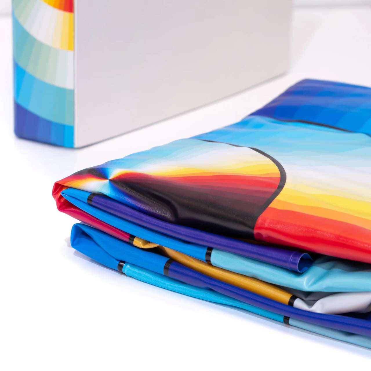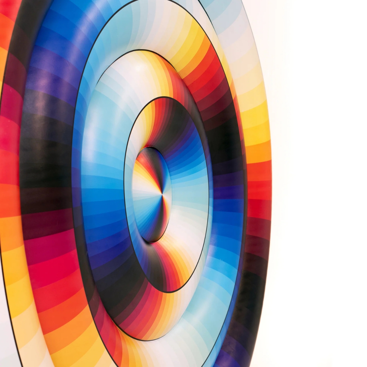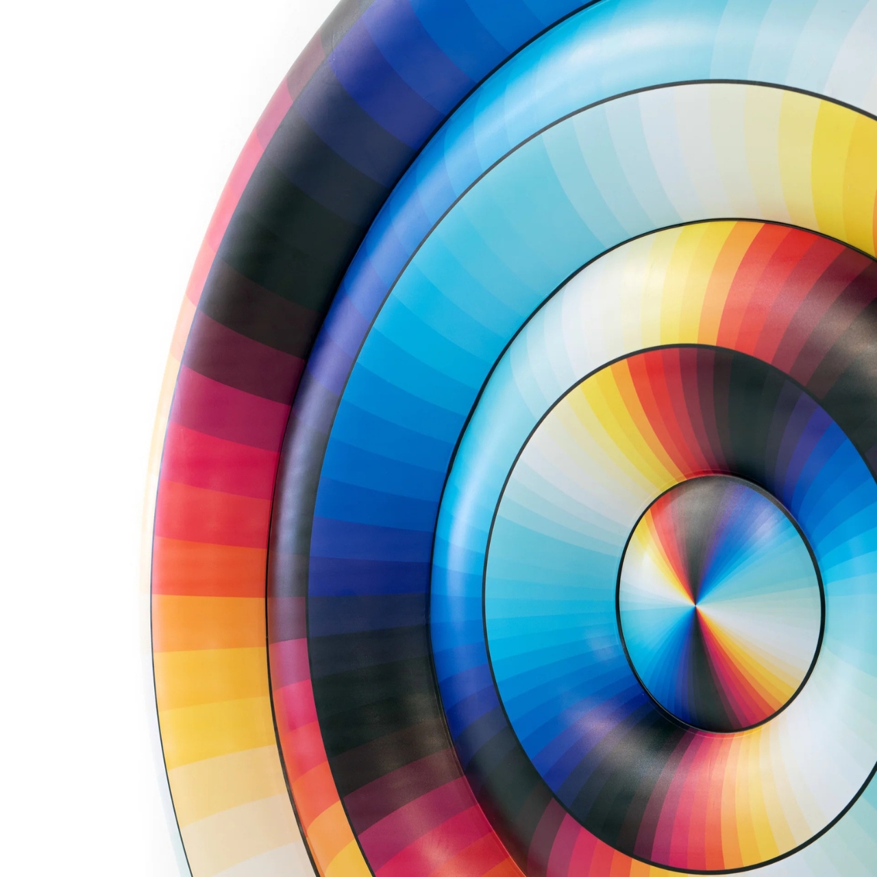 Spanish contemporary artist Felipe Pantone has made waves in the art world with his signature kinetic aesthetic, blending digital glitch art with bold geometric patterns and rainbow gradients. The CDM30 Inflatable Pool Lounger is immediately identifiable as an extension of Pantone’s other chromatic works, most notably the artist’s recent circularly-themed SUBTRACTIVE VARIABILITY series. This pool lounger brings that same visual intensity to functional design, creating a piece that’s equally at home floating in water or displayed as wall art.