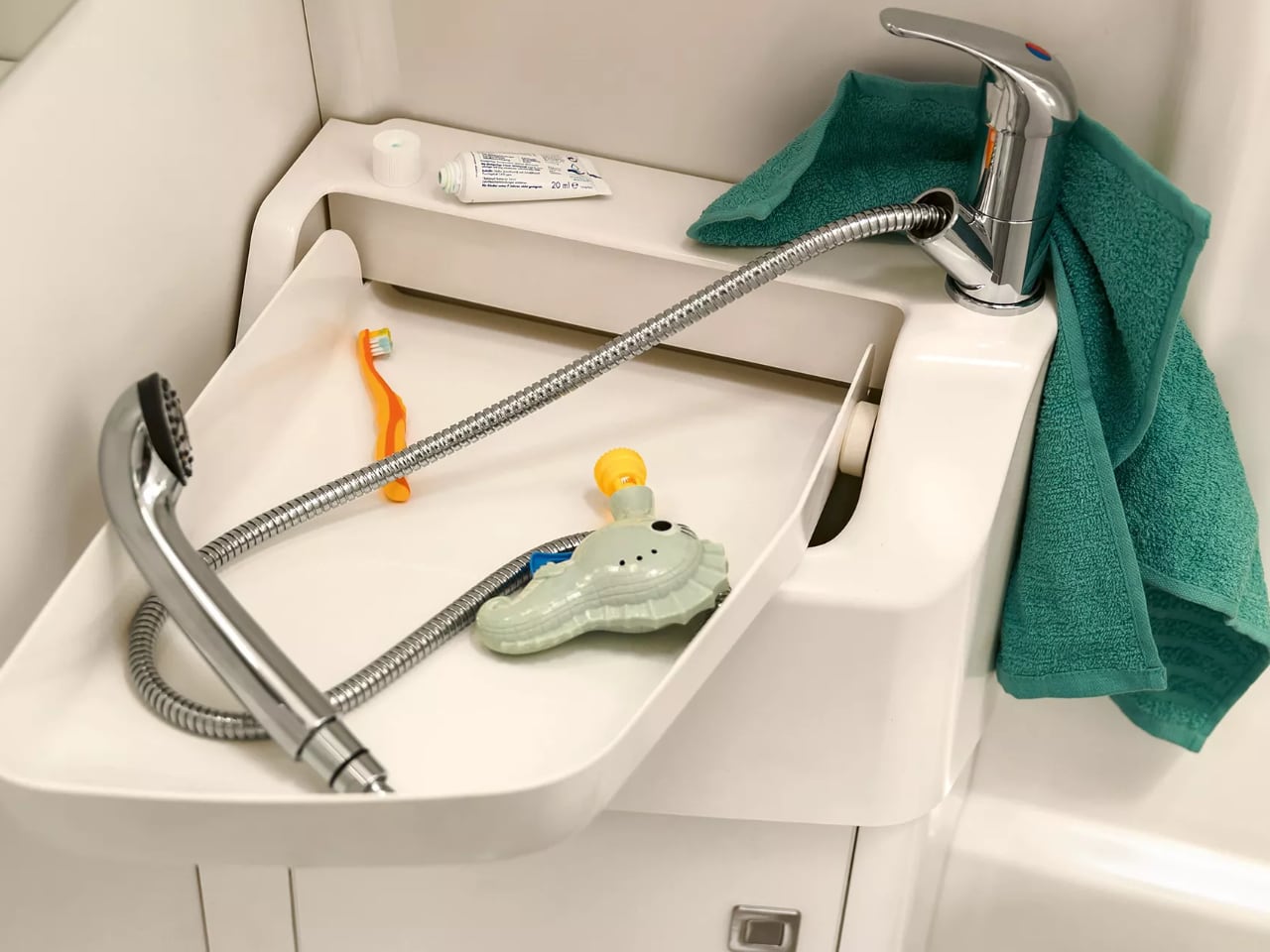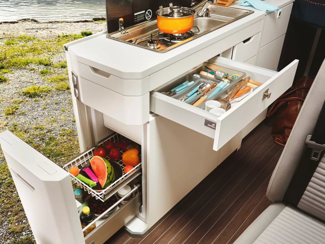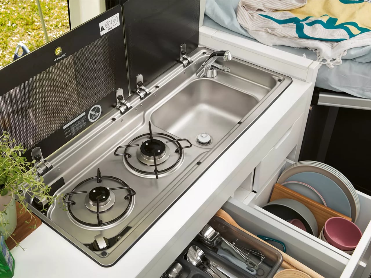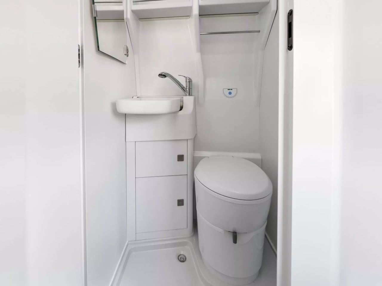 What really stands out is the wet bathroom – this separate wet room includes a proper shower, toilet, and space-saving fold-out wash basin. Motion sensor lighting kicks in automatically. Proper ventilation through a skylight keeps things fresh, while integrated shelving holds actual toiletries rather than travel-sized compromises. This isn’t the plastic portable toilet experience that haunts my camping nightmares.